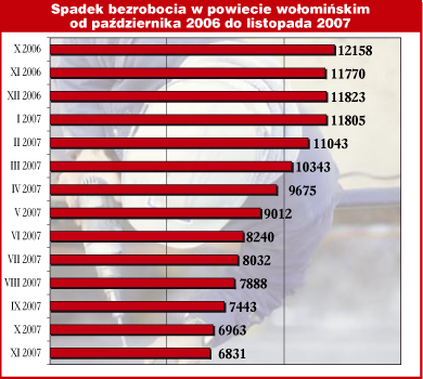Od października 2006 roku do listopada 2007 stopa bezrobocia w skali kraju, spadła o 3,6 punktu procentowego. W tym samym okresie na terenie powiatu wołomińskiego odnotowano spadek o 7,5 punktu procentowego.
