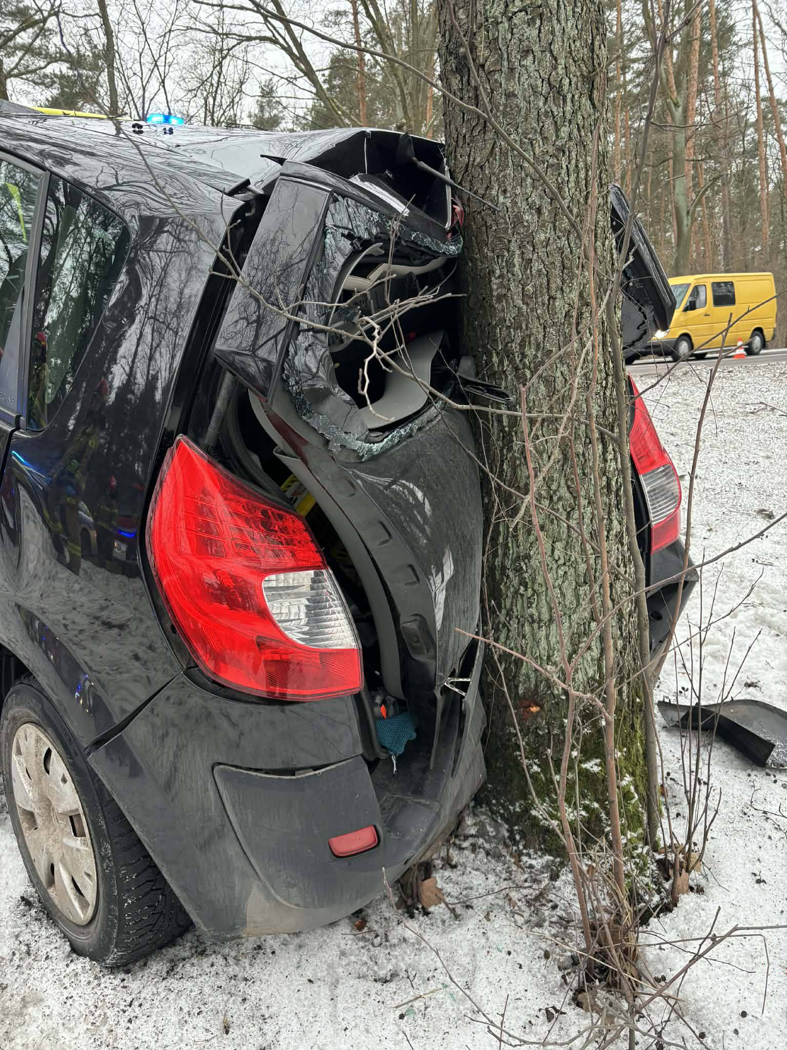 Obraz na miejscu zdarzenia był dramatyczny. Auto wbiło się tyłem w masywny pień drzewa. Siła uderzenia zmiażdżyła klapę bagażnika i wcisnęła elementy konstrukcyjne do wnętrza pojazdu. Rozbite szkło, powyginana blacha i ślady hamowania na zimowej nawierzchni świadczyły o gwałtowności zdarzenia. Samochód zatrzymał się dosłownie „owinięty” wokół drzewa.