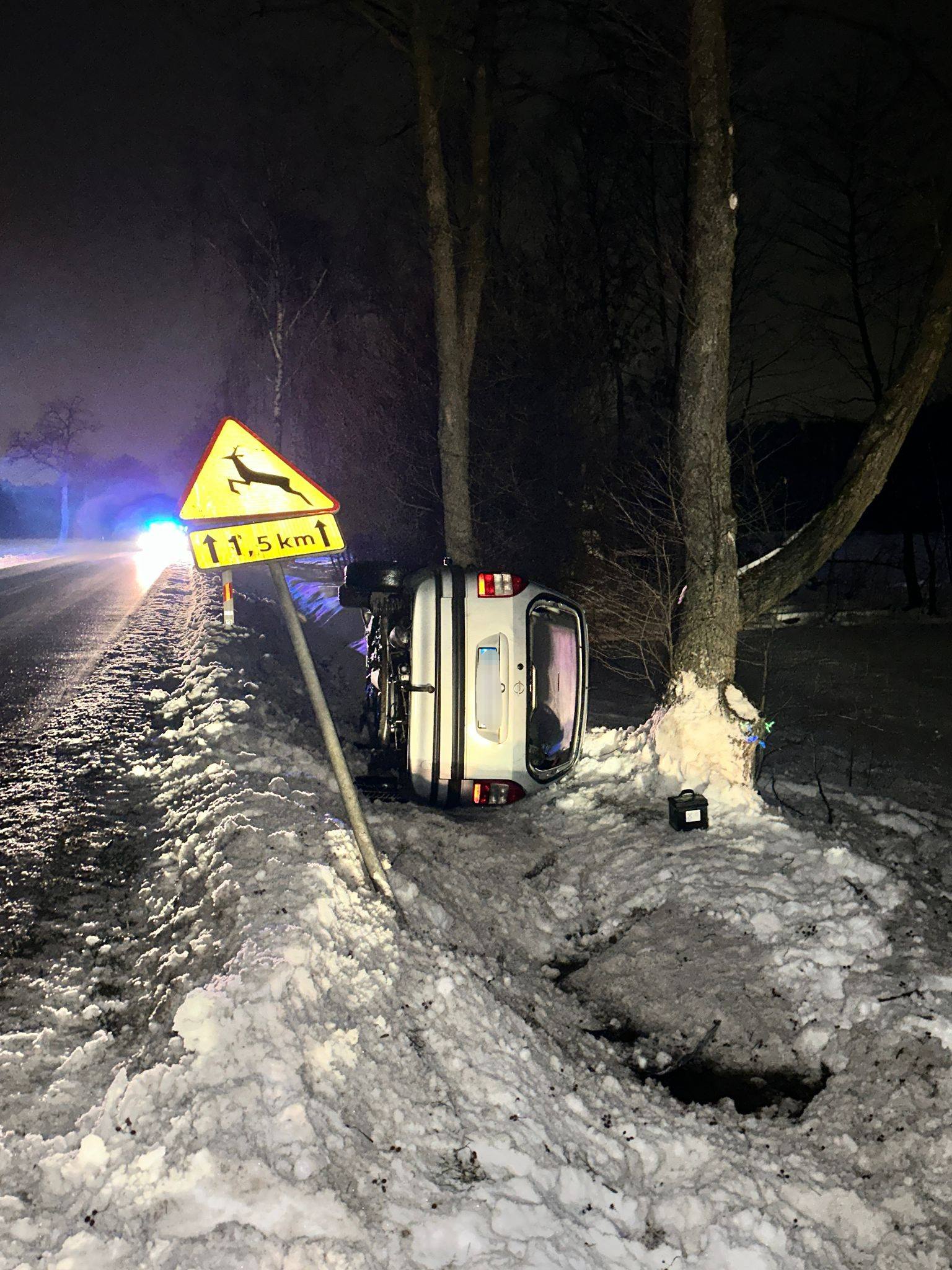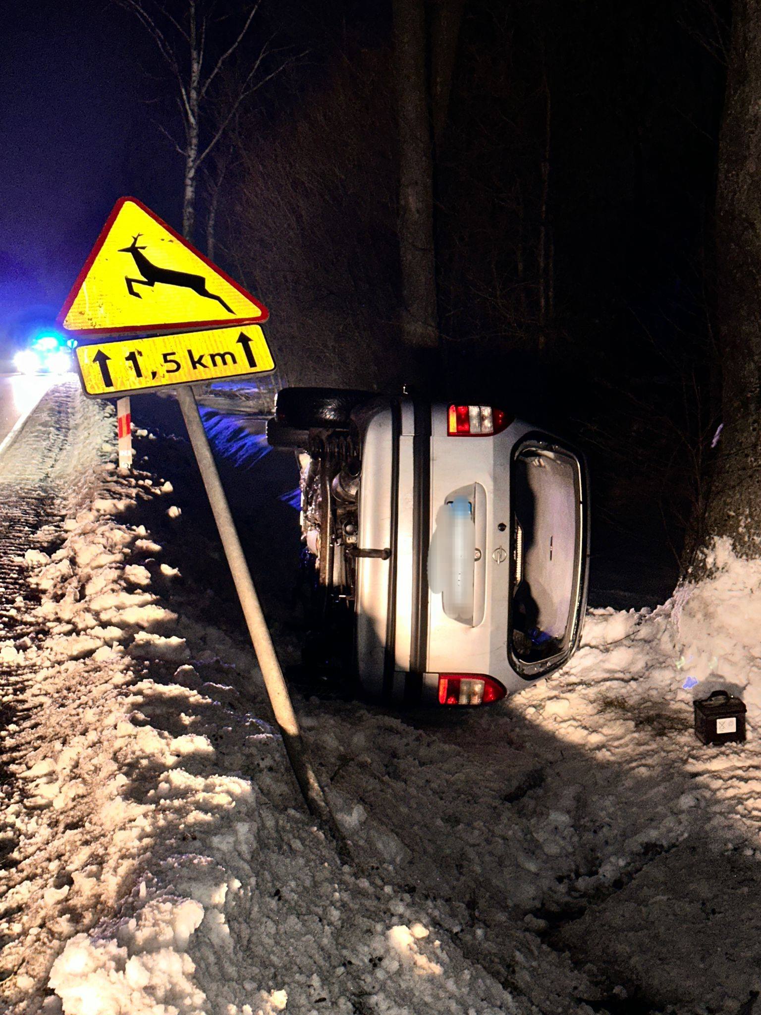 Po godzinie 16. na drodze wojewódzkiej nr 632 w rejonie miejscowości Latonice (gmina Nowe Miasto) doszło do groźnie wyglądającego zdarzenia drogowego z udziałem samochodu osobowego marki Opel. Zimowa aura i zapadający zmrok sprawiły, że sytuacja wyglądała wyjątkowo dramatycznie — na miejscu widać było przewrócony pojazd leżący na boku w przydrożnym rowie, a wokół zalegał śnieg i lód, które tylko potęgowały zagrożenie.