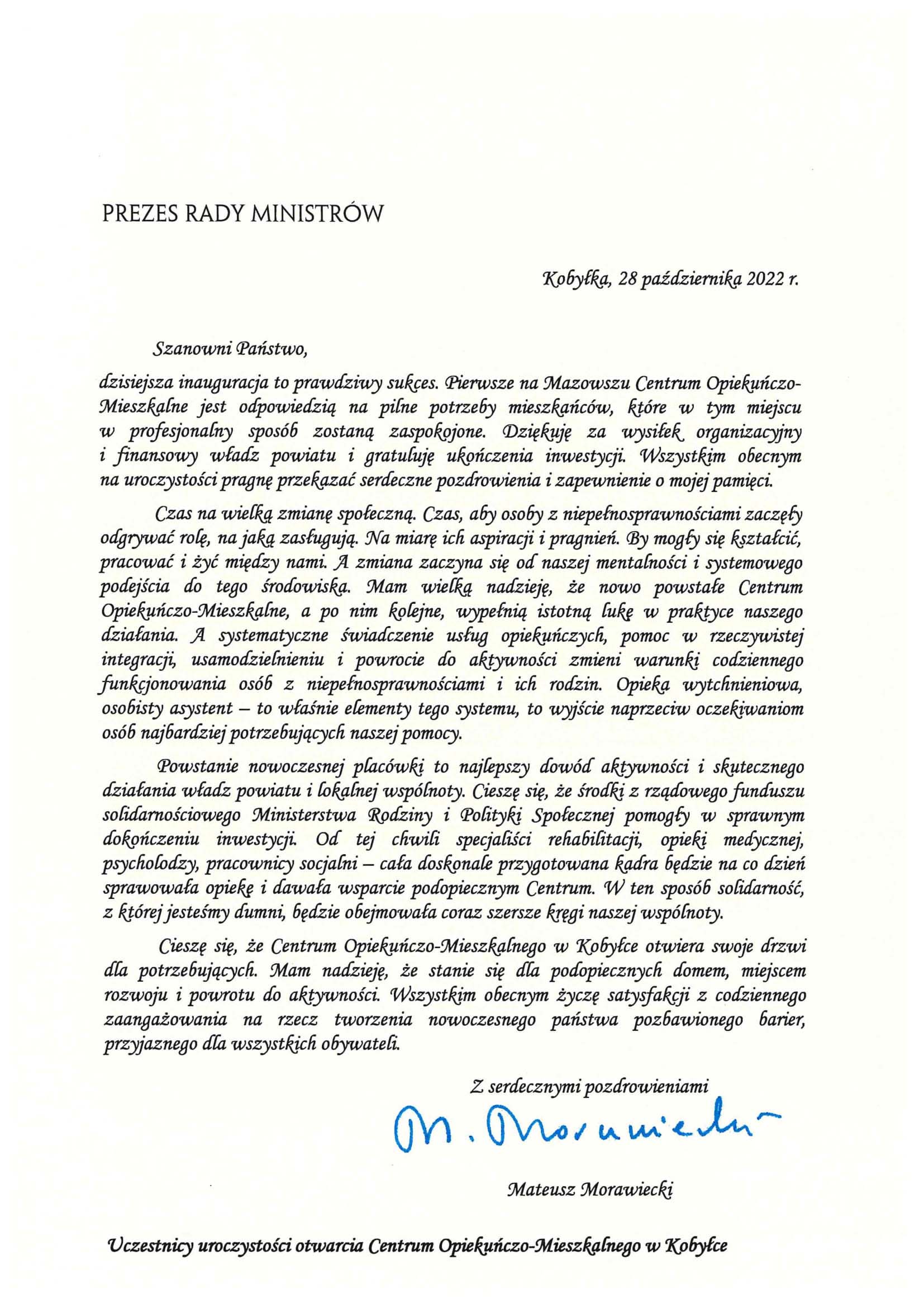 – Powstanie nowoczesnej placówki to najlepszy dowód aktywności i skutecznego działania władz powiatu i lokalnej wspólnoty. Cieszę się, że środki z rządowego funduszu solidarnościowego Ministerstwa Rodziny i Polityki Społecznej pomogły w sprawnym dokończeniu inwestycji – napisał w liście do uczestników wydarzenia przekazanym na ręce Starosty, Premier RP Mateusz Morawiecki.