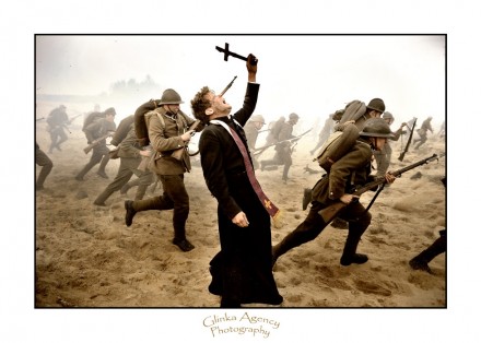 Przed wymarszem ks. kapelan uwijał się stale wśród żołnierzy, postarał się o chorągiew kościelną za miast sztandaru, spowiadał wszystkich i komunikował w kościele św. Florjana, słabszych na duchu doprowadzał perswazją do równowagi. W czasie pochodu kroczył obok pierwszej kompanji, nie chciał skorzystać ani z bryczki,ani ofiarowanego mu konia, nie gniewał się, choć chłopcy zbytkowali.