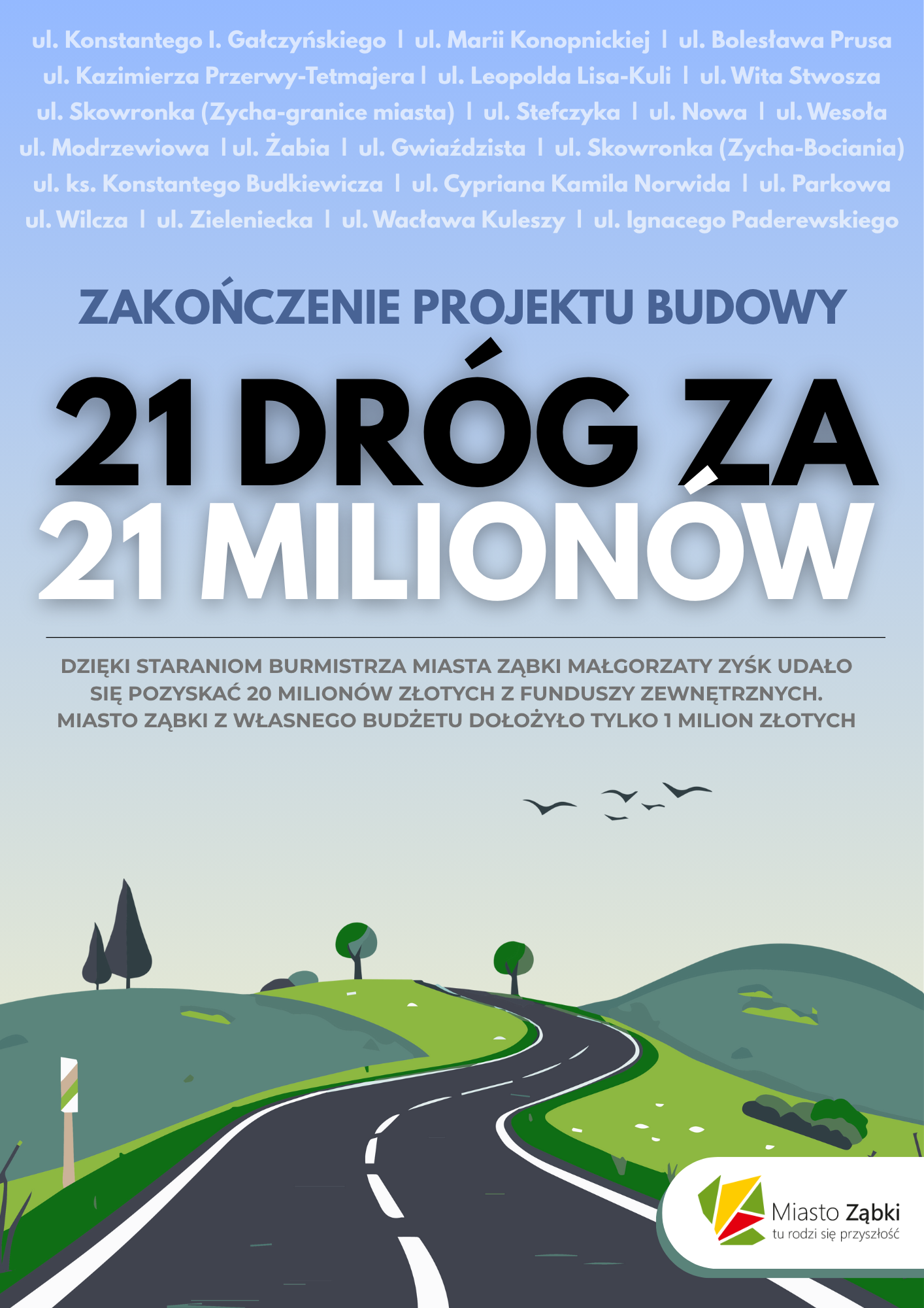 Ząbki mogą pochwalić się największą inwestycją drogową w swojej historii, która dobiegła końca. Na początku ubiegłego roku Burmistrz Miasta Ząbki Małgorzata Zyśk, podpisała umowę na realizację 21 dróg. Całkowity koszt przedsięwzięcia wyniósł imponujące 21 milionów złotych, z czego aż 20 milionów złotych pochodziło z zewnętrznego dofinansowania w ramach programu „Poprawa stanu dróg publicznych na terenie Miasta Ząbki – Polski Ład”. Dofinansowanie zewnętrzne wyniosło 95% kosztów. Miasto do inwestycji dołożyło jednie 1 mln. zł.