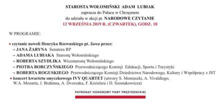 Starosta Wołomiński Adam Lubiak zapraszado Pałacu w Chrzęsnem na Narodowe Czytanie 2019 w czwartek 12 września o godz. 18.