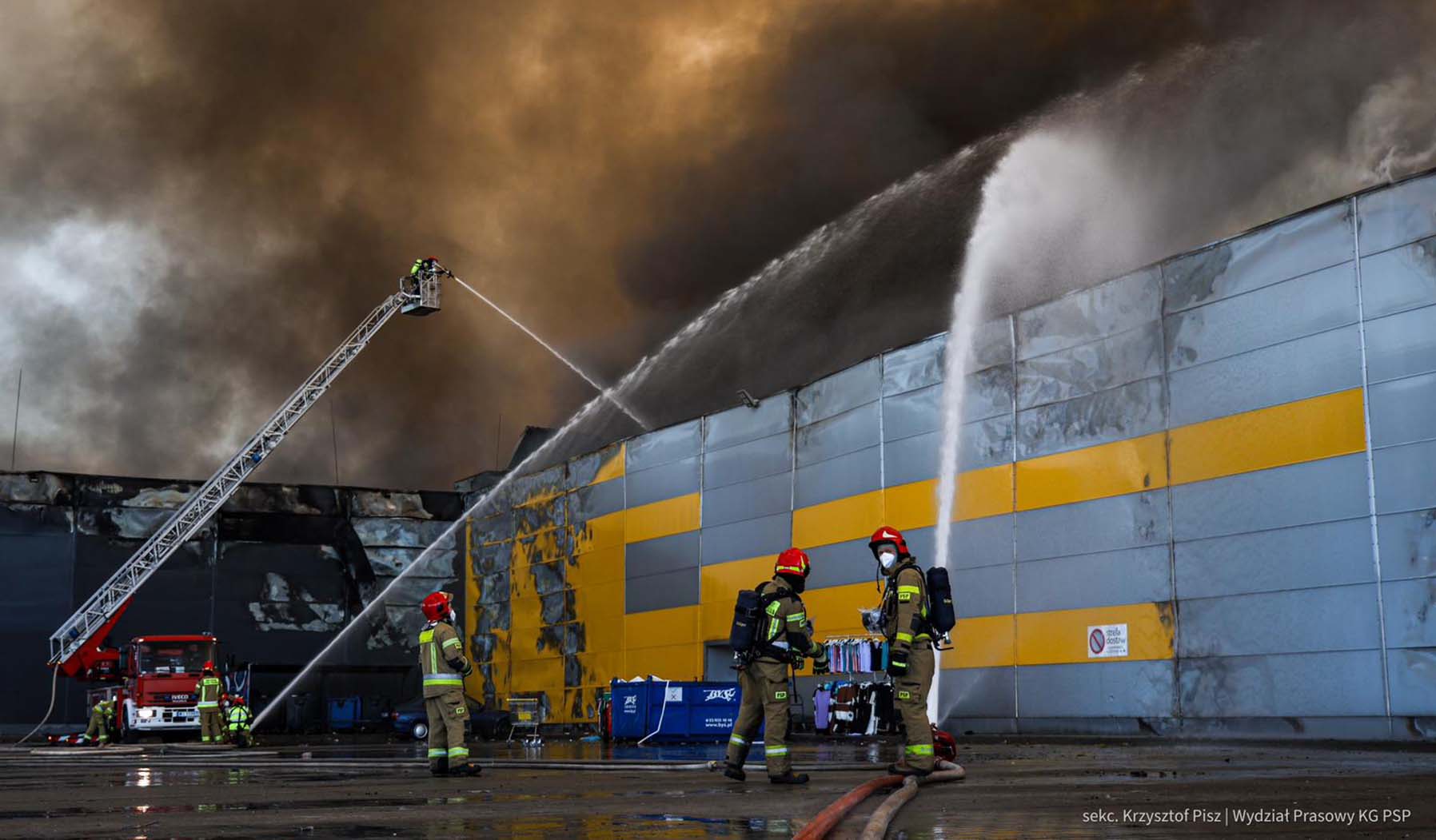 – Na miejscu otrzymaliśmy polecenie pracy na jednym z odcinków bojowych, a konkretnie podawanie prądu wody na teren hali – relacjonuje kpt. Sobków. – Pracowaliśmy do godz. 12.30 w południe, później odesłano nas do domów. Warunki były trudne z powodu temperatury i zadymienia. Nasi strażacy używali sprzętu ochrony dróg oddechowych. Ten sprzęt i kombinezony wprawdzie zapewniają komfort pracy i chronią przed oparzeniami, ale jednak czuje się temperaturę wydzielaną przez własne ciało, a do tego żar z zewnątrz. Trzeba było także używać kamer termowizyjnych, które widzą przez dym i dzięki nim wiadomo, w którą stronę podawać strumień wody.