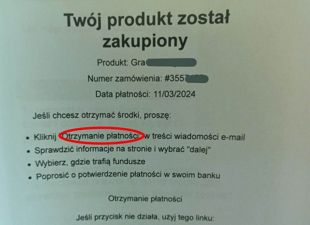 Nie klikaj w pole „otrzymanie płatności”. To oszustwo.