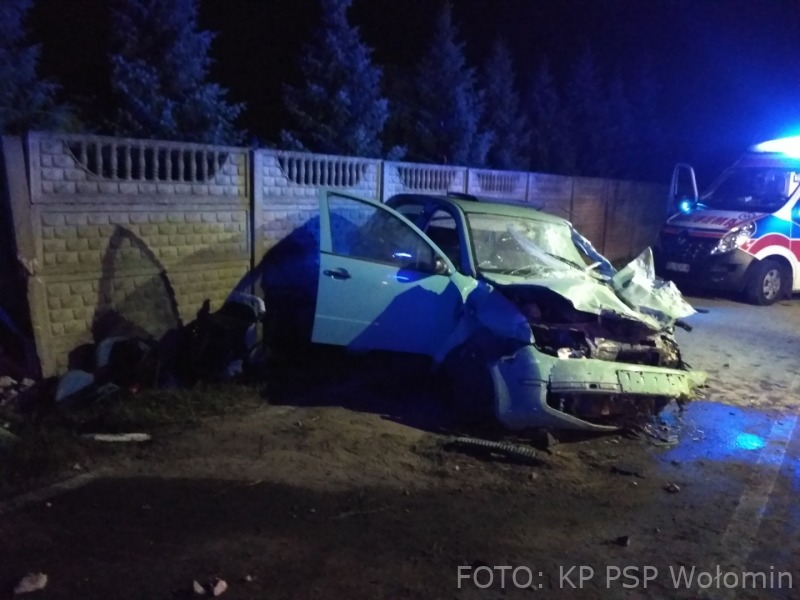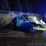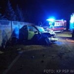 Do zdarzenia doszło ok. godz. 1.40. Przybyły na miejsce zastęp Straży zastała samochód marki Skoda, który uderzył w betonowe ogrodzenie. Kierowca pojazdu (mężczyzna), przebywał w pojeździe, posiadał widoczne obrażeń głowy oraz ręki, po przybyciu Zespołu Ratownictwa Medycznego został zabrany do szpitala Lotniczym Pogotowiem Ratunkowym. Działania Straży polegały na zabezpieczeniu miejsca zdarzenia, usunięciu płynów eksploatacyjnych, szkła i plastiku z jezdni, wyznaczeniu lotniska dla LPR oraz pomocy medycznej dla poszkodowanego.