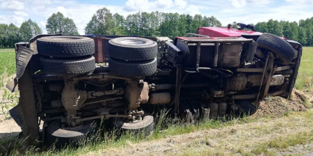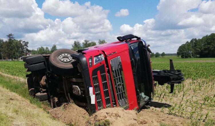 Według wstępnych ustaleń mundurowych kierujący ciężarowym volvo 22 – letni mieszkaniec powiatu ostrołęckiego podjął manewr wyprzedzania ciągnika rolniczego z podpiętą grabarką. W wyniku tego stracił panowanie nad pojazdem i zjechał na pobocze. Ostatecznie volvo przewróciło się na lewy bok. Na szczęście jego kierowcy nic się nie stało.