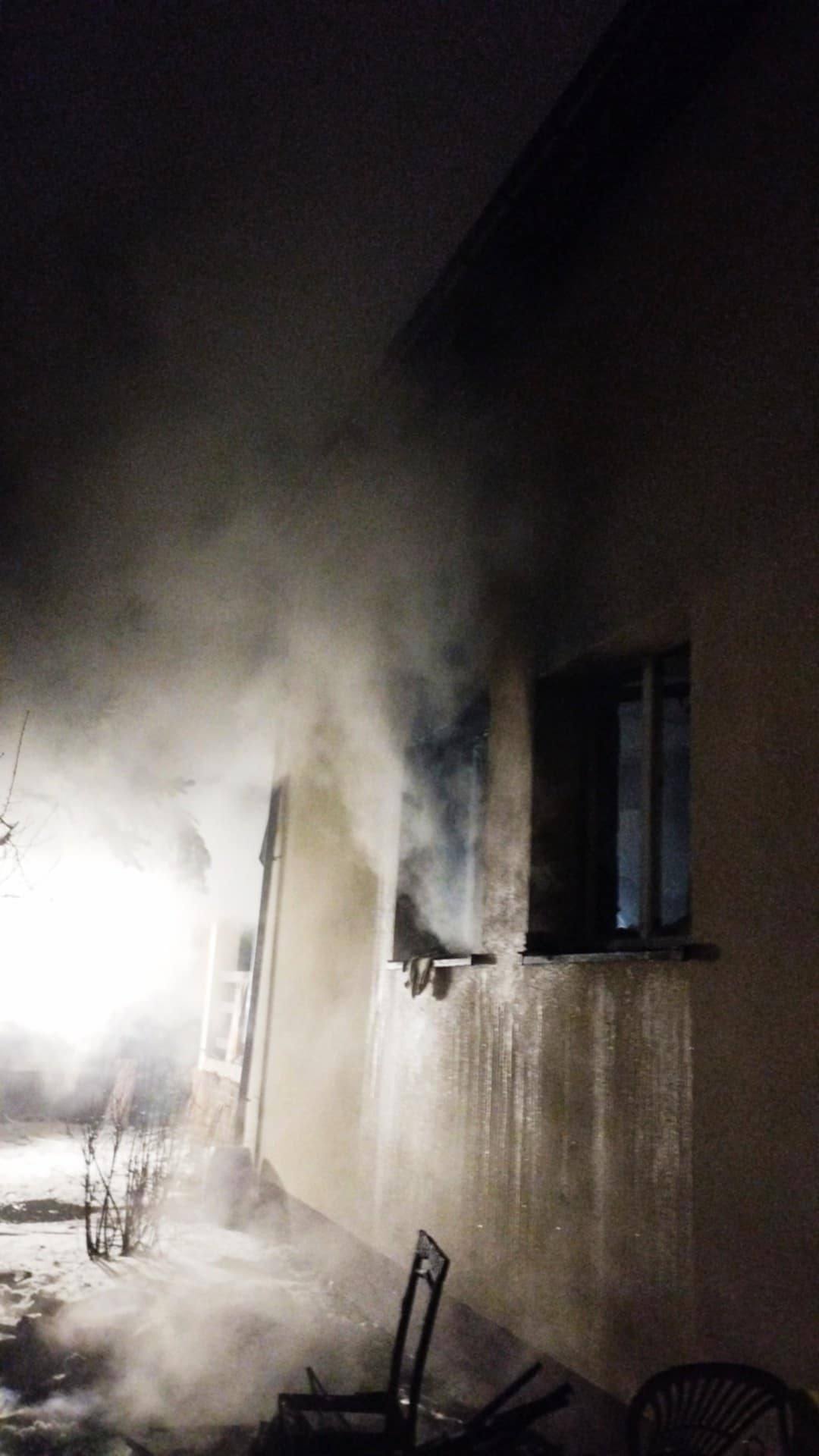 Nocny pożar budynku w Stryjkach. Na miejscu liczne zastępy straży pożarnej.
