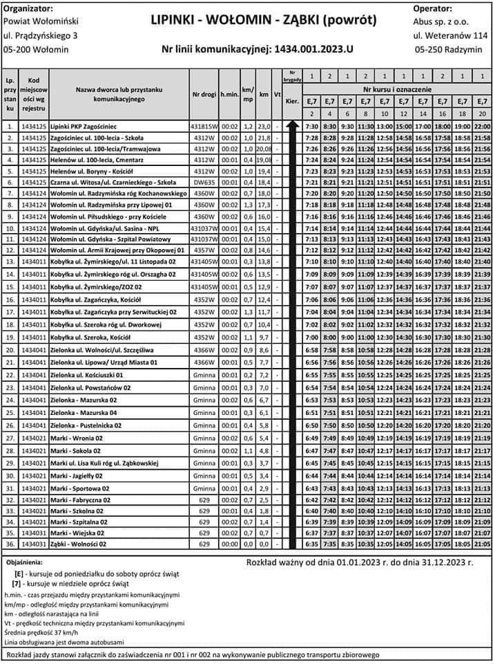 Autobusy będą kursować między miejscowościami Lipinki – Zagościniec – Helenów – Czarna – Wołomin – Kobyłka – Zielonka – Marki – Ząbki (przy M1).