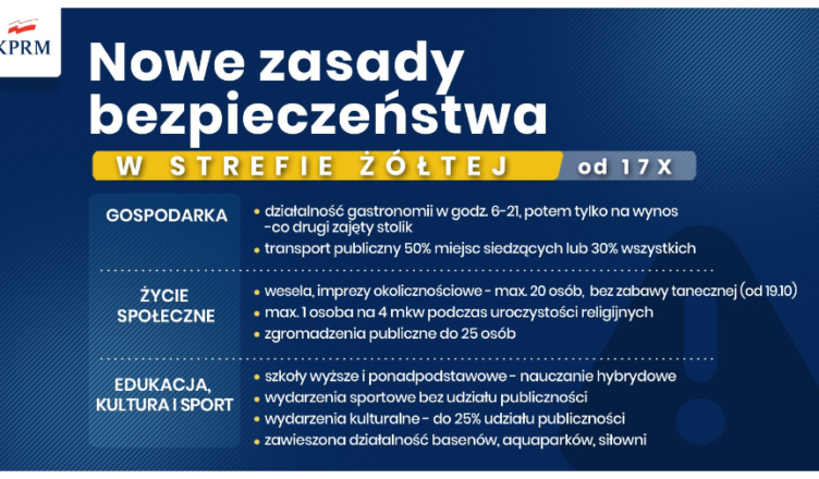 Od 17 października zmienią się zasady bezpieczeństwa obowiązujące w strefie żółtej i czerwonej. Powiat Wołomiński pozostaje na kolejny tydzień w strefie żółtej, natomiast Warszawa od soboty znajdzie się w strefie czerwonej.