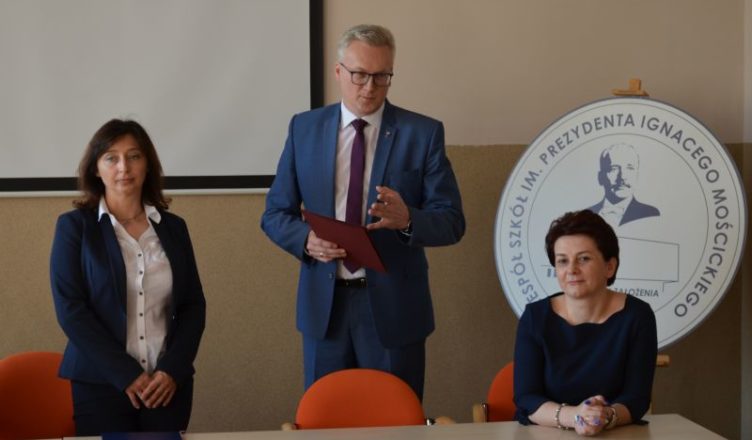 Porozumienie o współpracy w zakresie kształcenia zawodowego dla Zespołu Szkół im. Prezydenta Ignacego Mościckiego w Zielonce podpisane z udziałem Starosty Wołomińskiego Adama Lubiaka.