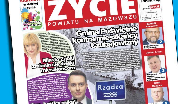 Najnowsze papierowe wydanie „Życia Powiatu na Mazowszu” obfituje w wywiady i artykuły poświęcone problemom z jakimi borykają się mieszkańcy i samorządy lokalne. Na szczęście nie tylko problemami żyjemy więc są też informacje sprawiające radość. C w ostatnim czasie wzburza krew mieszkańców poszczególnych gmin? Problemom z Poświętnego swój artykuł poświęciła Barbara Wiśniowska w artykule p.t.: „Gmina Poświętne kontra mieszkańcy Czubajowizny” tu decyzja władz gminy Poświętne o planowanej lokalizacji gminnej oczyszczalni ścieków na działce nr 120 w Czubajowiźnie wywołuje burzę wśród mieszkańców, którzy stanowczo sprzeciwili się inwestycji, wskazując, że proponowana lokalizacja zagraża zarówno ich codziennemu życiu, jak i bezcennym terenom przyrodniczym w okolicy. Z tekstu wynika, że władze gminy zdają się zupełnie lekceważyć fakt, że tego rodzaju inwestycja nie tylko degraduje unikalne ekosystemy, ale i zasadniczo obniża wartość krajobrazową i rekreacyjną gminy, przy czym ryzyko zanieczyszczenia rzeki Rządza dotknie florę i faunę wzdłuż całego jej nurtu. Z kolei części mieszkańców Zielonki i sąsiadującej z nią Kobyłki nie odpowiada lokalizacja inwestycji mieszkaniowej przez prywatnego właściciela na terenie Miasta Zielonka Zapraszamy do przeczytania wywiadu z Kamilem Michałem Iwandowskim, burmistrzem Zielonki p.t.: „Czy „krótka rolka” zawsze wygrywa z rzetelną informacją?”. Tradycyjnie nie zabrakło analizy finansowej Gminy Wołomin autorstwa Dominika Kozaczki. Znajdziecie też ciekawe teksty mówiące o tym czym żyją Marki, Ząbki czy Jadów. Warto też obejrzeć wywiady video w ramach programu „Gość ŻYCIA – Teresa Urbanowska zaprasza”.