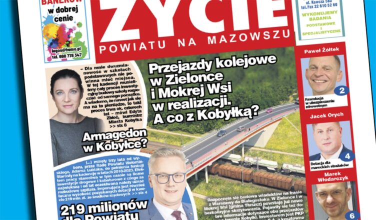 W najnowszym papierowym wydaniu ?Życia? znajdziecie m.inn. Informacje o trwającej rozbudowie linii kolejowej w związku z budową wiaduktów na trasie z Warszawy do Białegostoku. W Zielonce i w Mokrej Wsi (gmina Tłuszcz) powstają już nowe bezkolizyjne skrzyżowania. Pojawiły się też dobre informacje dotyczące obu przejazdów na terenie Kobyłki. Możecie też sprawdzić dlaczego Burmistrz Miasta Kobyłka, Edyta Zbieć przestrzega przed ?Armagedonem? z jakim miasto będzie musiało się wkrótce zmierzyć. Tradycyjnie, w bieżącym wydaniu, nie zabrakło porad Pawła Żółtka z biura księgowego mojerozliczenia.pl To tylko niektóre z poruszanych przez naszą redakcję zagadnień. Zapraszamy do lektury