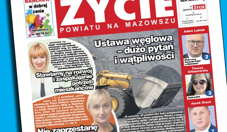 W najnowszym wydaniu „papierowej wersji” Życia Powiatu na Mazowszu zapraszamy do lektury wywiadu z Adamem Lubiakiem, starostą wołomińskim, którego redaktor Teresa Urbanowska zapytała o to czy, kiedy i gdzie powstanie nowa siedziba Komendy Powiatowej Policji? Nasz nowy redakcyjny kolega Rafał Orych sprawdził jakie plany mają lokalne samorządy w związku z ustawą węglową. W wydaniu znajdziecie również rozmowę z Małgorzatą Zyśk, burmistrz Miasta Ząbki, tekst o kulisach ostatniej awarii kanalizacji w Kobyłce spowodowanej przez wykonawcę tunelu w Kobyłce. Zapytaliśmy też wieloletnią przewodnicząca Rady Miasta Zielonka o powody rezygnacji z tej funkcji. To oczywiście tylko niektóre z poruszonych na łamach najnowszego wydania „Życia” tematów. Zapraszamy do lektury.