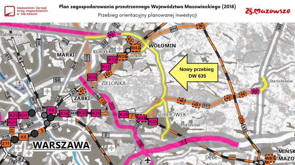 Budowa ponad 21-kilometrowego odcinka drogi wojewódzkiej nr 635 to długo wyczekiwana inwestycja przez mieszkańców powiatów wołomińskiego.. Rozpoczęte prace koncepcyjne stanowią kontynuację inwestycji zakończonej w 2021 roku, która obejmowała budowę odcinka drogi wojewódzkiej nr 635 od węzła drogi ekspresowej S8 w Wołominie do miejscowości Czarna. Nowa droga połączy drogę krajową S8 (Wrocław-Warszawa-Białystok) z drogą krajową nr 2, a w pobliżu miejscowości Okuniew w gminie Halinów będzie krzyżowała się z drogą wojewódzką nr 637 relacji Warszawa-Węgrów.