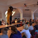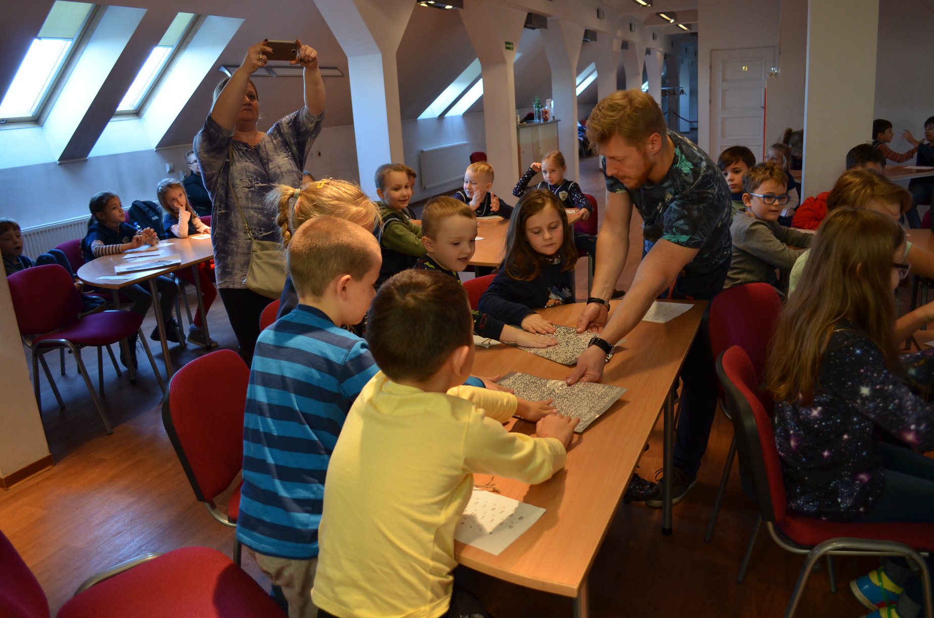 i na pewno wielu uczestników zapamięta na bardzo długo ten dzień, niektórzy może do końca życia. Podczas podwójnego spotkania z Michałem Zawadką, przenieśliśmy się do epoki kamienia łupanego, gdzie oglądaliśmy pierwsze malowidła, spotkaliśmy również wodza szaloną literę i pismo kipu, sprawdzaliśmy też czy łatwo czytać w alfabecie Braille?a. Wszystko to oczywiście w celu poznania historii pisma, komunikacji i do pokazania, jakim nośnikiem do pobudzania wyobraźni są książki.