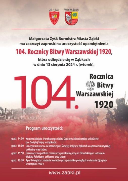 W nadchodzący wtorek, 13 sierpnia 2024 roku, Ząbki staną się miejscem uroczystości upamiętniających 104. rocznicę Bitwy Warszawskiej 1920 roku. Burmistrz miasta, Małgorzata Zyśk  zaprasza mieszkańców i gości do udziału w uroczystości.
