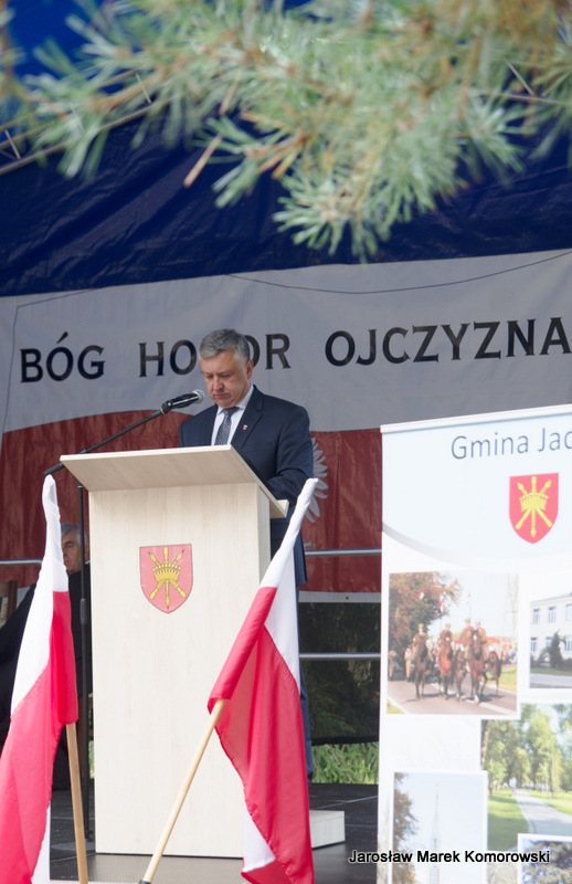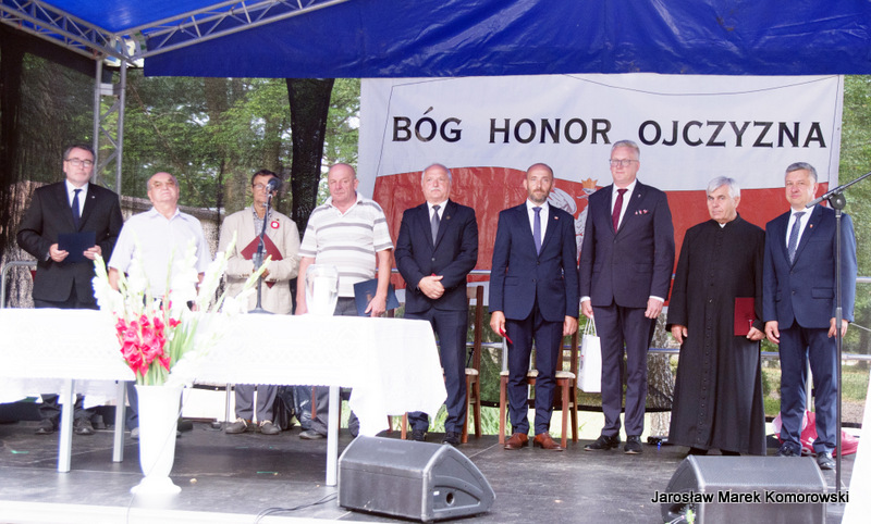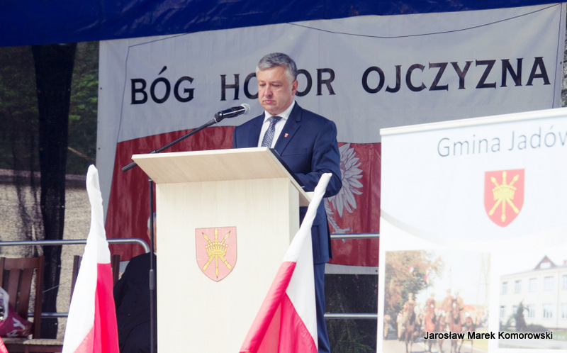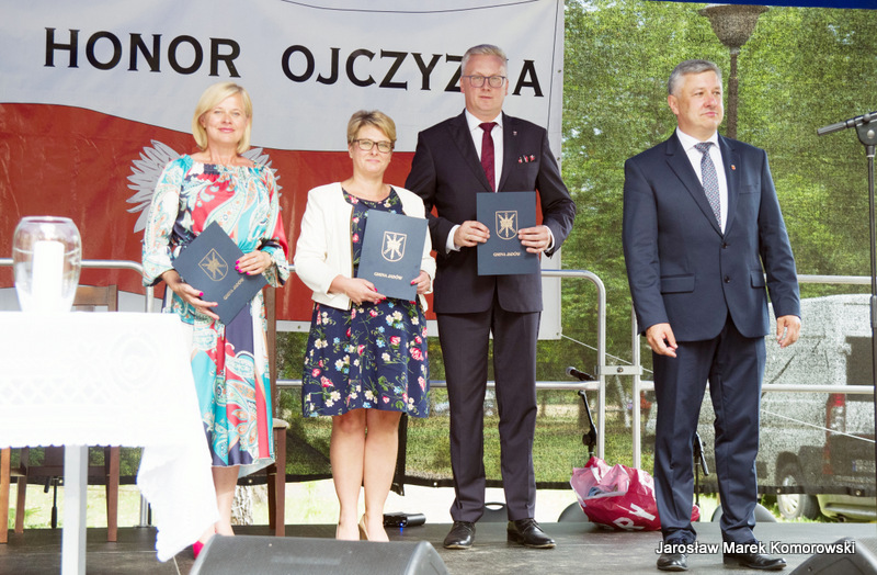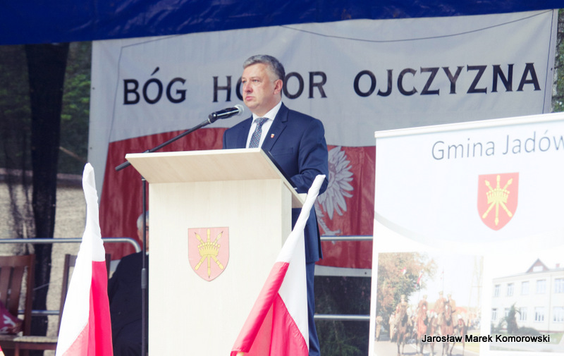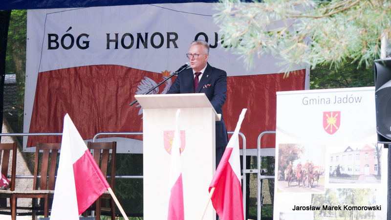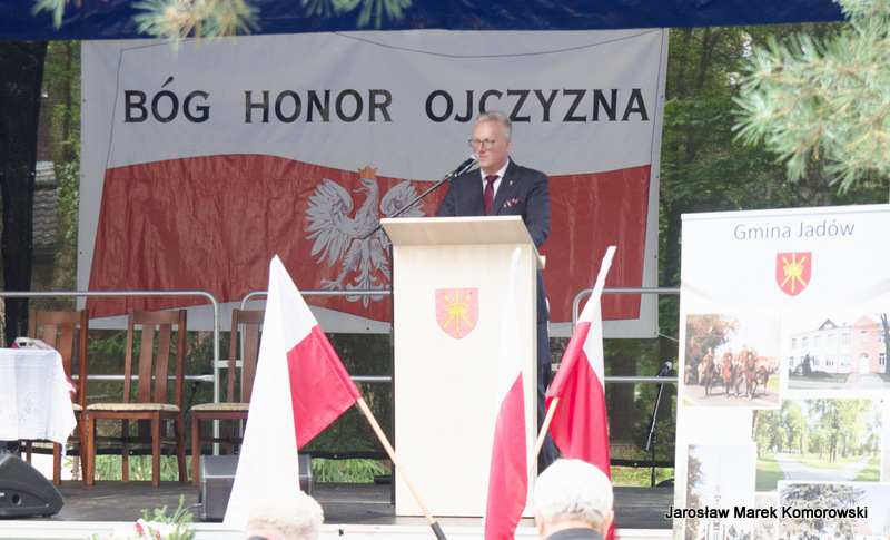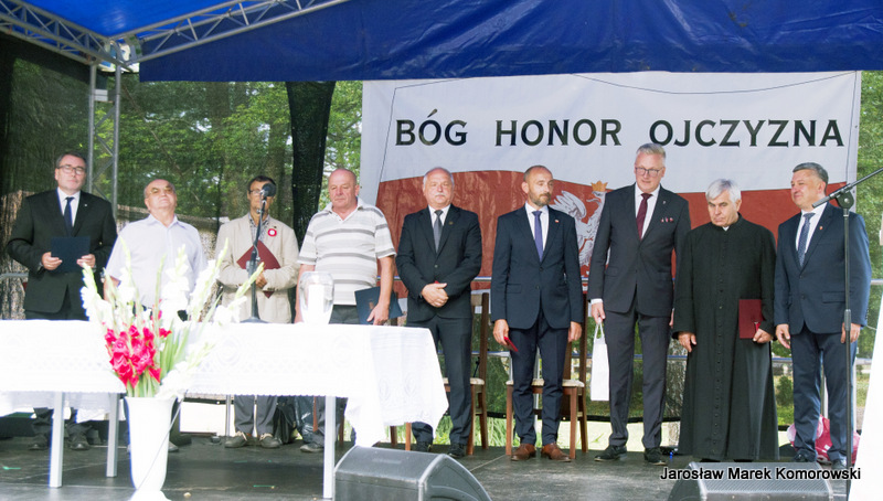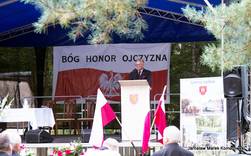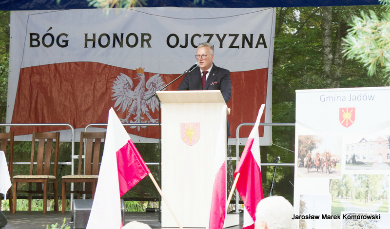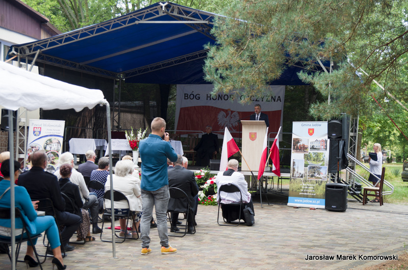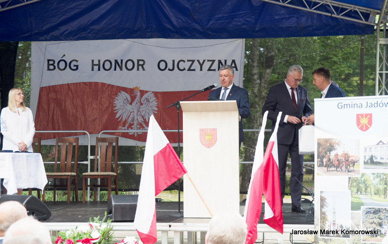 Po mszy Wójt Gminy Jadów Dariusz Kokoszka przywitał przybyłych gości: Bożenę Żelazowską – posłankę do Sejmu RP, Adama Lubiaka – Starostę wołomińskiego wraz z małżonką Katarzyną Lubiak – radną Miasta Stołecznego Warszawy, Cezarego Jurkiewicza – radnego M.S. Warszawy, Andrzeja Wysockiego – komendanta Powiatowej Państwowej Straży Pożarnej w Wołominie, Magdalenę Suchenek i Piotra Borczyńskiego – radnych Rady Powiatu wołomińskiego, Romana Postka – dyrektora Muzeum Zbrojowni na Zamku w Liwie, Artura Rogalskiego – kustosza Muzeum w Liwie, Marię Łopuską – dyr. LO im. Bitwy Warszawskiej 1920 r. w Urlach, Anielę Dobosiewicz – dyr. ZSP Urle, Urszulę Trzciałkowską – dyr. SP w Szewnicy, Łukasza Wójcika – dyr. GOK w Jadowie, Sylwię Tryc – dyr. Biblioteki Publicznej Gminy Jadów, Reginę Sadlik – Przewodniczącą Rady Gminy wraz z radnymi, Barbarę Wójcik – skarbnik gminy Jadów, Sławomira Miąskiewicza – sekretarza gminy Jadów, Kazimierę Snopkiewicz – sołtys Strachowa, sołtysów, poczty sztandarowe OSP Myszadła, LO w Urlach i OSP Starowola oraz zebranych gości. Następnie okolicznościowe przemówienia wygłosili; Poseł Bożena Zelazowska oraz Starosta Wołomiński Adam Lubiak, który wręczył pamiątkowe medale p. Maciejowi Wolińskiemu, p. Romualdowi Kalinowskiemu, p. Markowi Sawerze, ks. Kazimierzowi Klepackiemu, p. Cezaremu Jurkiewiczowi, p. Piotrowi Borczyńskiemu i p. Pawłowi Czyżewskiemu. Medalami wyróżnieni zostali również p. Halina Filemonowicz i p. Roman Gut.