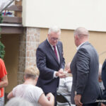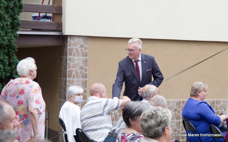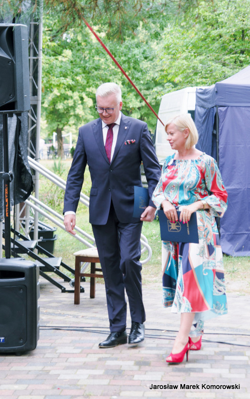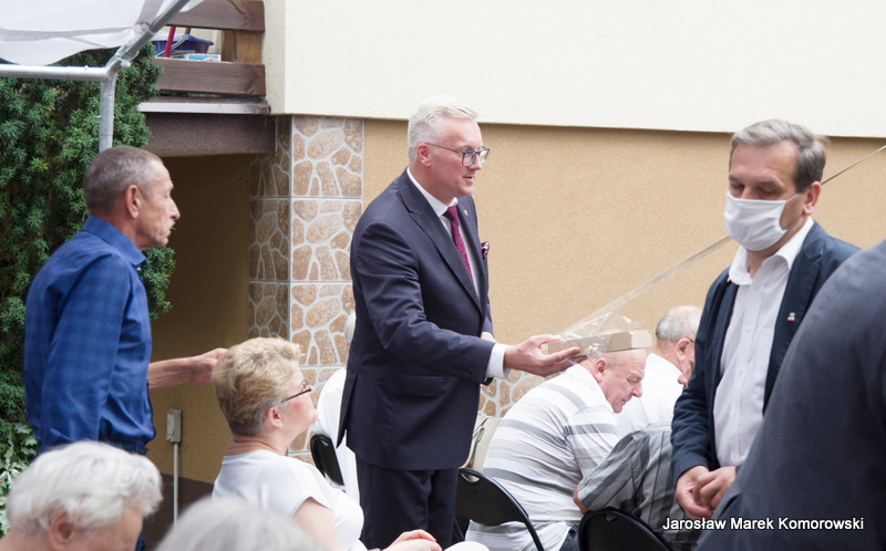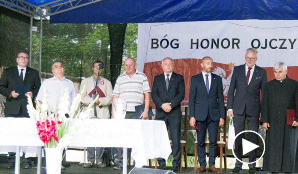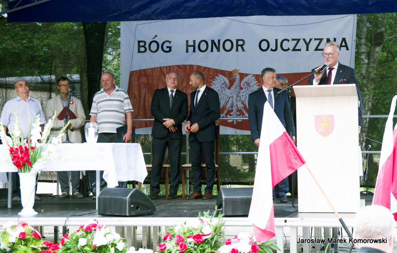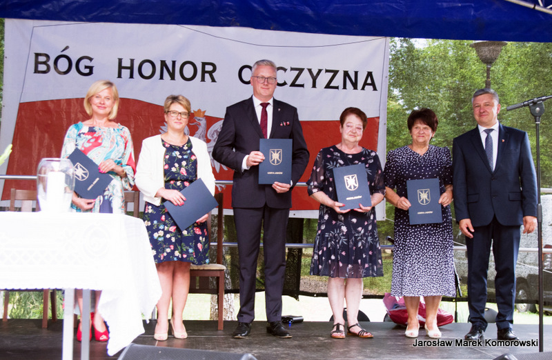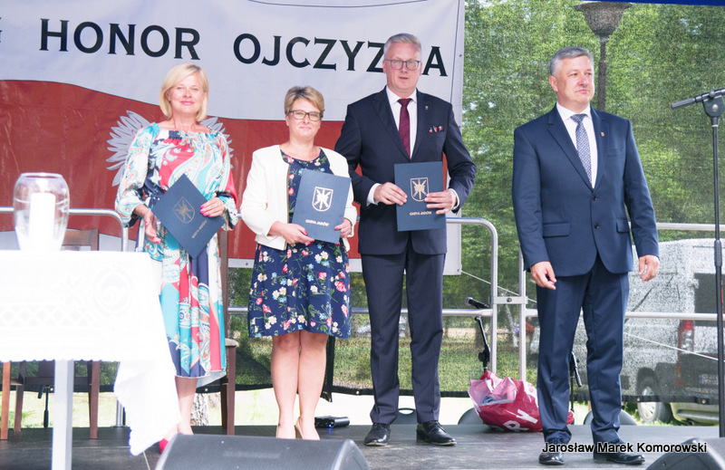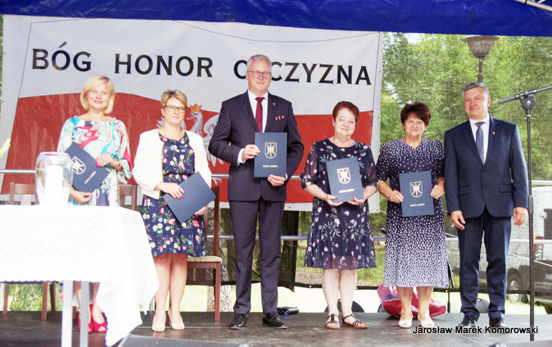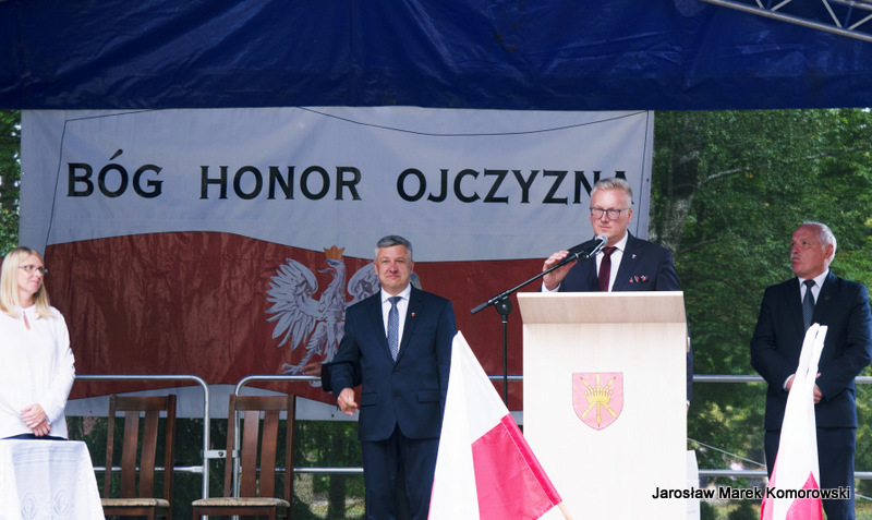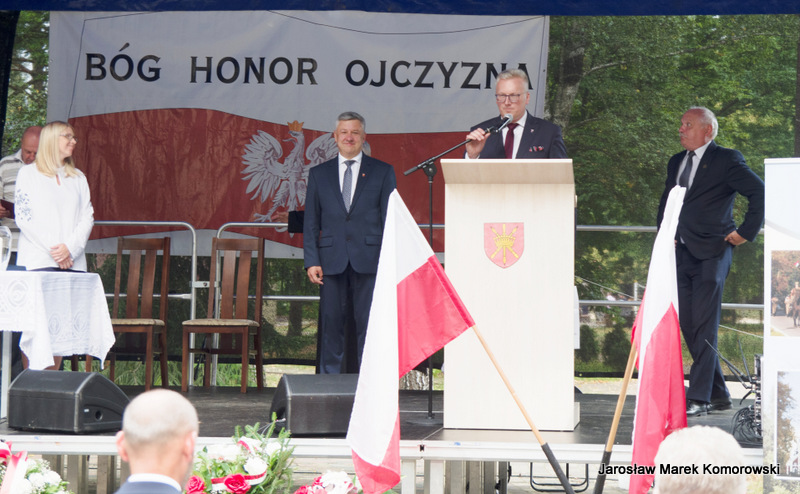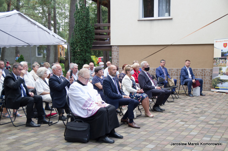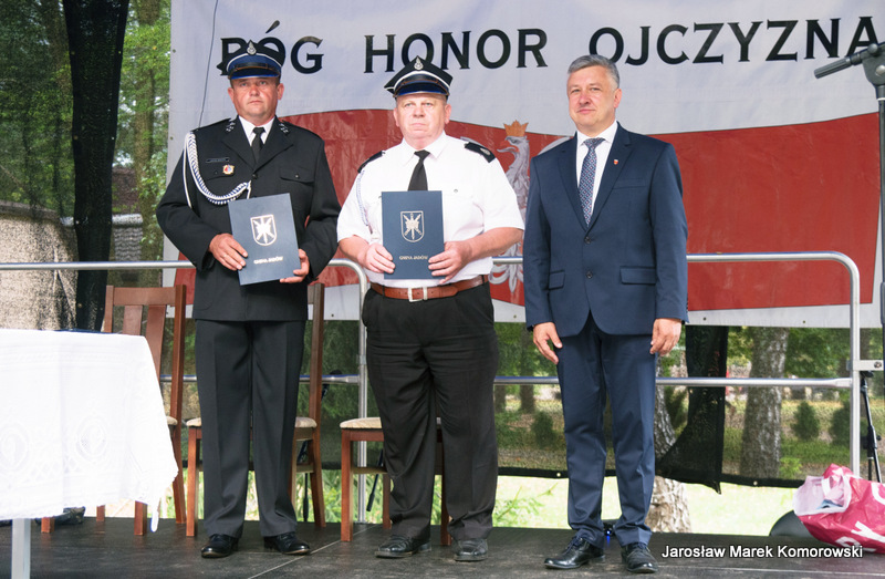 Po mszy Wójt Gminy Jadów Dariusz Kokoszka przywitał przybyłych gości: Bożenę Żelazowską – posłankę do Sejmu RP, Adama Lubiaka – Starostę wołomińskiego wraz z małżonką Katarzyną Lubiak – radną Miasta Stołecznego Warszawy, Cezarego Jurkiewicza – radnego M.S. Warszawy, Andrzeja Wysockiego – komendanta Powiatowej Państwowej Straży Pożarnej w Wołominie, Magdalenę Suchenek i Piotra Borczyńskiego – radnych Rady Powiatu wołomińskiego, Romana Postka – dyrektora Muzeum Zbrojowni na Zamku w Liwie, Artura Rogalskiego – kustosza Muzeum w Liwie, Marię Łopuską – dyr. LO im. Bitwy Warszawskiej 1920 r. w Urlach, Anielę Dobosiewicz – dyr. ZSP Urle, Urszulę Trzciałkowską – dyr. SP w Szewnicy, Łukasza Wójcika – dyr. GOK w Jadowie, Sylwię Tryc – dyr. Biblioteki Publicznej Gminy Jadów, Reginę Sadlik – Przewodniczącą Rady Gminy wraz z radnymi, Barbarę Wójcik – skarbnik gminy Jadów, Sławomira Miąskiewicza – sekretarza gminy Jadów, Kazimierę Snopkiewicz – sołtys Strachowa, sołtysów, poczty sztandarowe OSP Myszadła, LO w Urlach i OSP Starowola oraz zebranych gości. Następnie okolicznościowe przemówienia wygłosili; Poseł Bożena Zelazowska oraz Starosta Wołomiński Adam Lubiak, który wręczył pamiątkowe medale p. Maciejowi Wolińskiemu, p. Romualdowi Kalinowskiemu, p. Markowi Sawerze, ks. Kazimierzowi Klepackiemu, p. Cezaremu Jurkiewiczowi, p. Piotrowi Borczyńskiemu i p. Pawłowi Czyżewskiemu. Medalami wyróżnieni zostali również p. Halina Filemonowicz i p. Roman Gut.