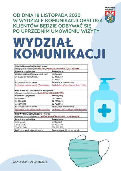 Od 18 listopada b.r. w Wydziale Komunikacji obsługa klientów będzie odbywać się po uprzednim umówieniu wizyty.