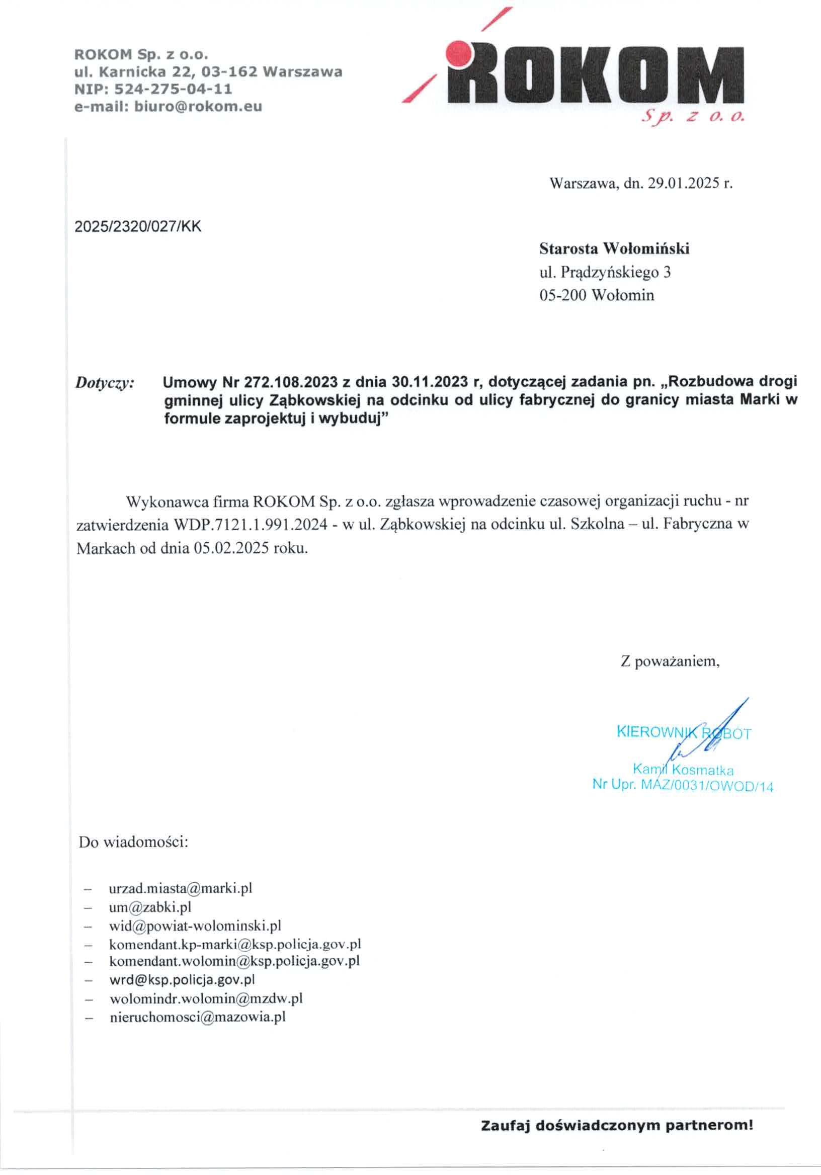 Firma firma ROKOM Sp. z o.o. realizująca na zlecenie miasta Marki przebudowę ul. Ząbkowskiej zgłasza wprowadzenie od środy 05.02.2025r. czasowej organizacji ruchu: (numer zatwierdzenia WDP.7121.1.991.2024) w ul. Ząbkowskiej na odcinku ul. Szkolona – ul. Fabryczna. Ul. Ząbkowska w Markach to przedłużenie ul. Szpitalnej na terenie Ząbek.