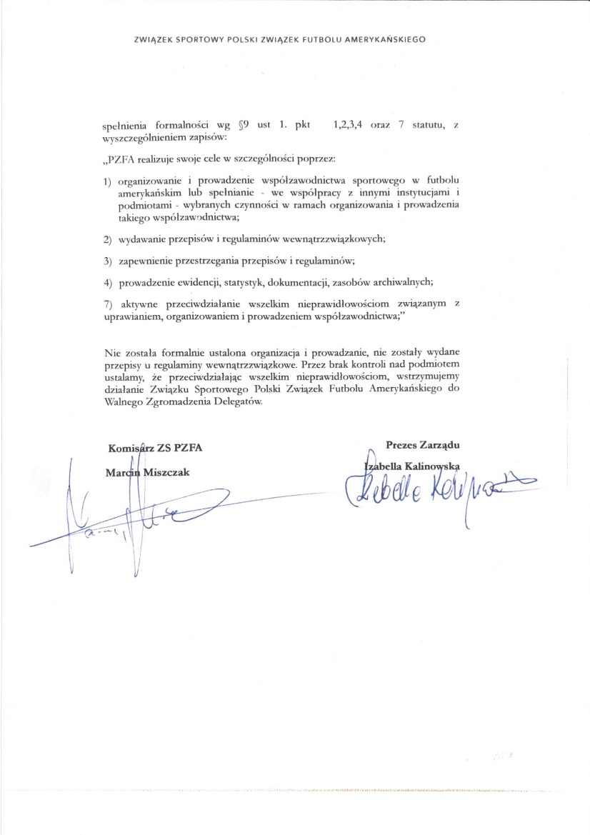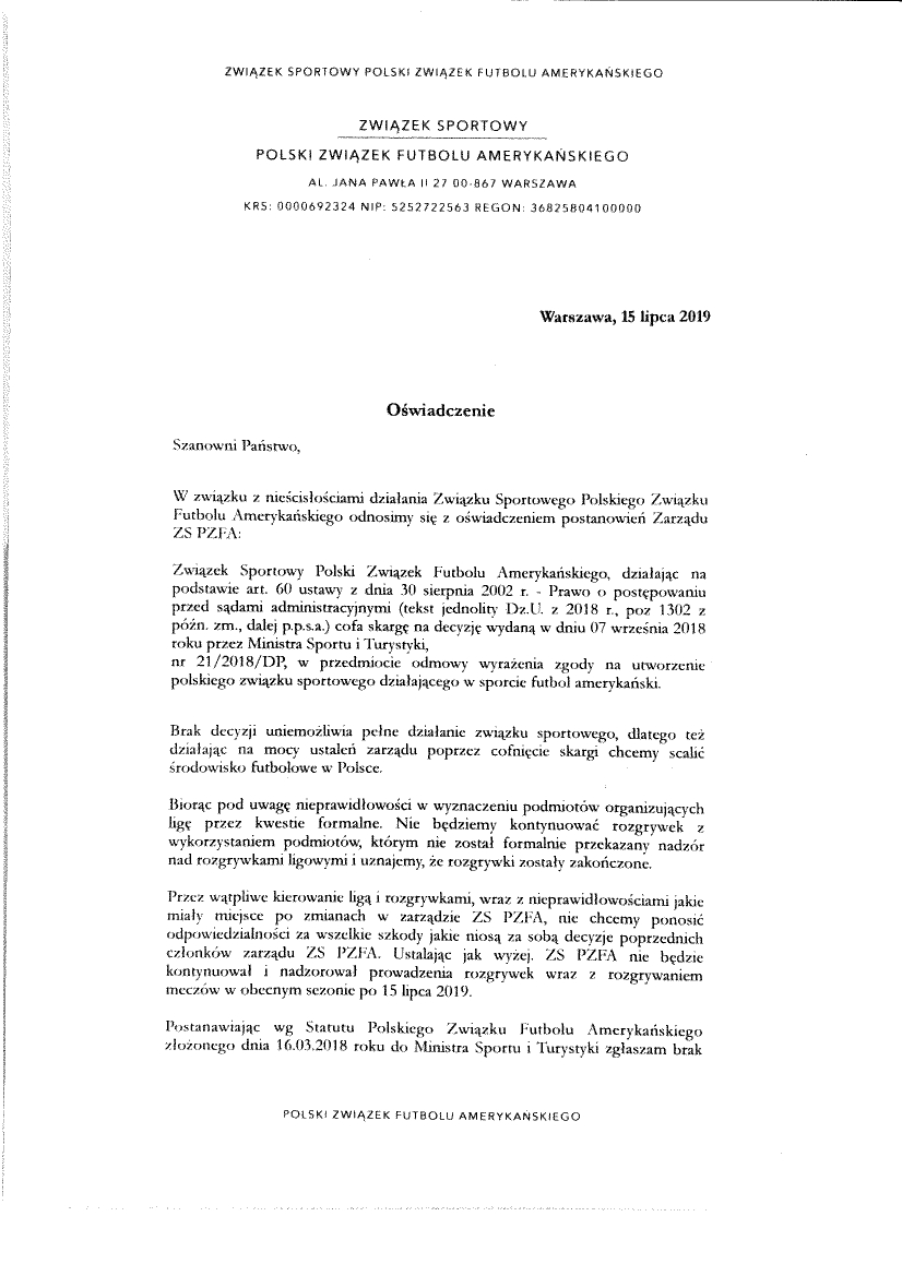 W załączeniu zamieszczamy oświadczanie, które UM Ząbki otrzymał od Polskiego Związku Futbolu Amerykańskiego.