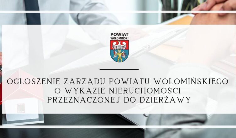 Stosownie do art. 35 ust. 1 ustawy z dnia 21 sierpnia 1997 r. o gospodarce nieruchomościami (Dz.U. z 2023 r. poz. 344) Zarząd Powiatu Wołomińskiego podaje do publicznej wiadomości, że w Starostwie Powiatowym w Wołominie, został sporządzony, opublikowany i podany do publicznej wiadomości na okres 21 dni, wykaz nieruchomości, stanowiących własność Powiatu Wołomińskiego przeznaczonych do oddania w dzierżawę.