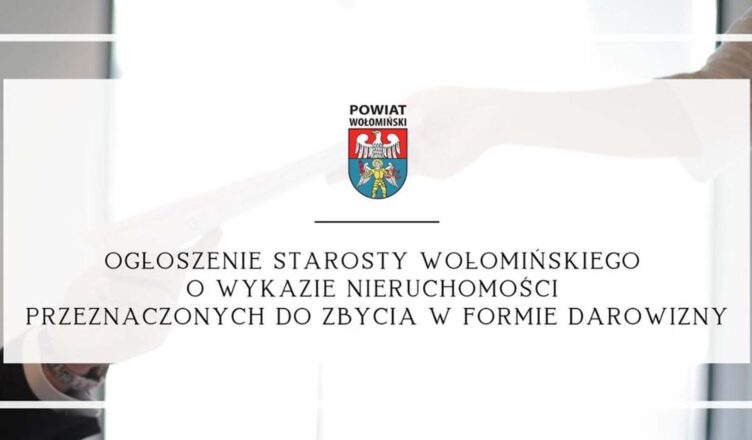 Stosownie do art. 35 ust. 1 ustawy z dnia 21 sierpnia 1997 r. o gospodarce nieruchomościami (Dz.U. z 2023 r. poz. 344) Starosta Wołomiński podaje do publicznej wiadomości, iż na tablicy ogłoszeń w Starostwie Powiatowym w Wołominie przy ul. Powstańców 8/1- w Wołominie wywieszono na okres 21 dni, wykaz nieruchomości przeznaczonych do zbycia w formie darowizny.