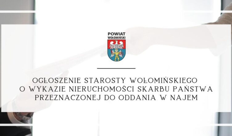 Stosownie do art. 35 ust. 1 ustawy z dnia 21 sierpnia 1997 r. o gospodarce nieruchomościami (Dz. U. z 2023 r. poz. 344) Starosta Wołomiński podaje do publicznej wiadomości, iż na tablicy ogłoszeń w Starostwie Powiatowym w Wołominie przy ul. Powstańców 8/10 w Wołominie wywieszono na okres 21 dni tj. od 07.07.2023 r. do 27.07.2023 r., wykaz nieruchomości Skarbu Państwa przeznaczonych do oddania w najem.