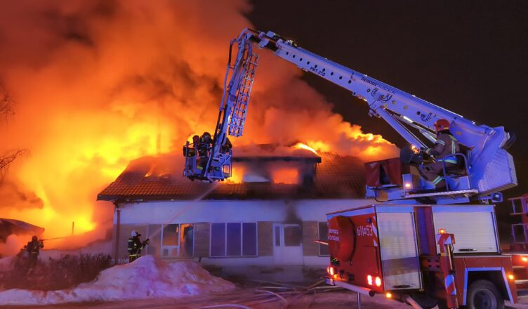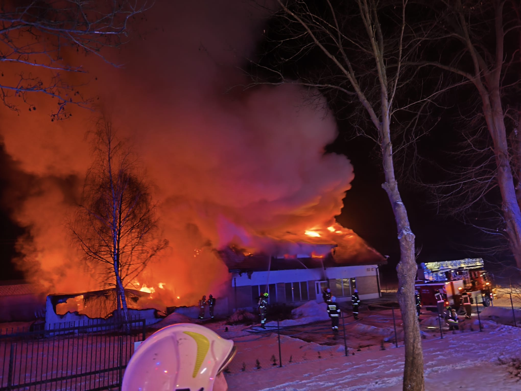 Kłęby gęstego, czarnego dymu unoszą się wysoko nad okolicą, a łuna ognia rozświetla nocne niebo. Na miejscu strażacy zastają w pełni rozwinięty pożar budynku oraz hali przylegającej bezpośrednio do niego.