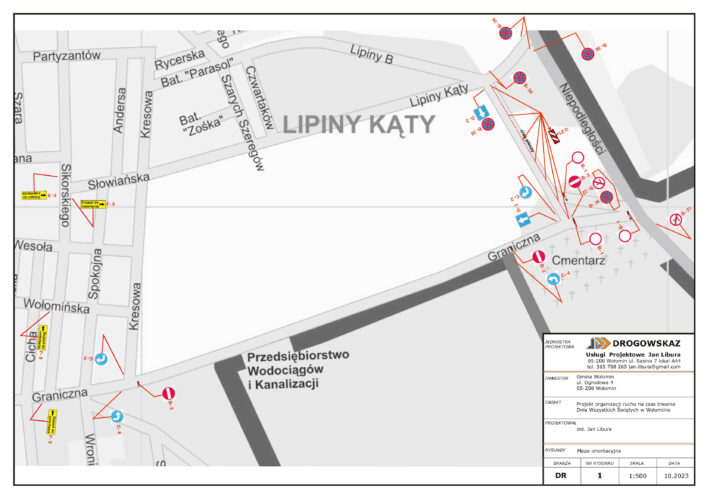 Projekt organizacji ruchu dojazdu do cmentarza wołomińskiego w dniach 01-02.11.2023r. przewiduje oznakowanie miejsca wyłączonego z ruchu ulicy Granicznej niezbędne do bezpiecznego przeprowadzenia obchodów.