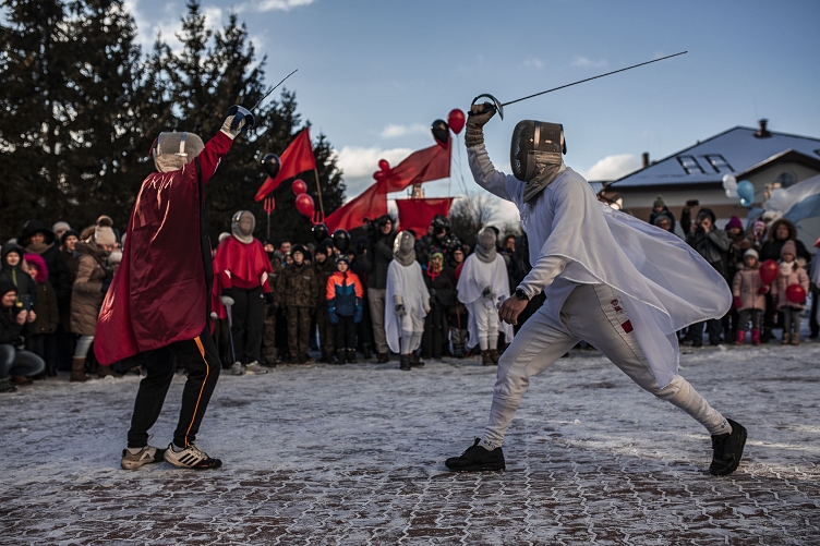 Orszak Trzech Króli już po raz drugi w naszym mieście organizowała fundacja WZRASTAJ Edukacja Kultura Sport. Rozpoczął się on walką dobra ze złem (UKS Szabla Ząbki) oraz radosnym tańcem maleńkich aniołków (PP nr 3). Orszak poprowadzili Maryja z Józefem oraz dzieci z kółka misyjnego, pod opieką ząbkowskich Strzelców. Trzech królowie prezentowali się na koniach dostojnie i wzbudzali ogólne zainteresowanie. Król reprezentujący Afrykę to rodowity Egipcjanin, od kilku lat mieszkający w Ząbkach. Dużym zaskoczeniem okazała się krótka, ale świetnie wykonana, scenka z królem Herodem. Na wysokości drewnickiego szpitala uczestnicy Orszaku zobaczyli nagle na wysokim tronie zirytowanego władcę (Patryk Jóźwik), któremu towarzyszył dwuosobowy chórek (Julia Jóźwik, Ania Fijałkowska). Młodzież przygotowała tę świetną scenkę pod kierunkiem p. Anny Kozioł. W parku Orszak przywitała św. Rodzina, góralska orkiestra i domowe zwierzęta, do których lgnęły szczególnie dzieci.