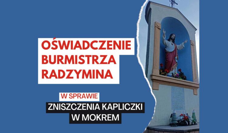 Zniszczenie ponad 100-letniej kapliczki w miejscowości Mokre wywołało powszechne oburzenie.. Ten cenny obiekt, mający zarówno wartość historyczną, jak i duchową, został bezmyślnie zrujnowany podczas prac związanych z przebudową drogi powiatowej. Burmistrz Radzymina, Krzysztof Chaciński, stanowczo potępił ten akt, oczekując wyjaśnień od inwestora oraz wykonawcy robót, a także podjęcia działań na rzecz odbudowy