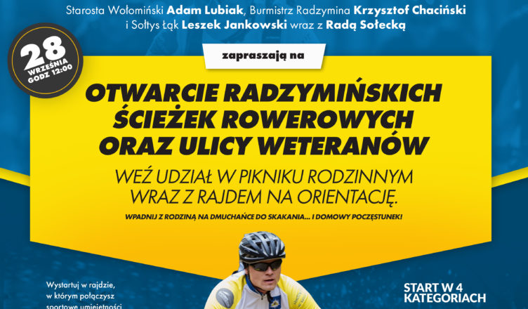 Starosta Wołomiński Adam Lubiak, Burmistrz Radzymina Krzysztof Chaciński, Sołtys Łąk Leszek Jankowski wraz z Radą Sołecką oraz Klub Kamyk Radzymin MTB Team zapraszają w sobotę, 28 września na uroczystość symbolicznego otwarcia ul. Weteranów i ścieżki rowerowej, połączoną z rajdem rowerowym na orientację „Orientuj się” i piknikiem sołeckim w Łąkach.