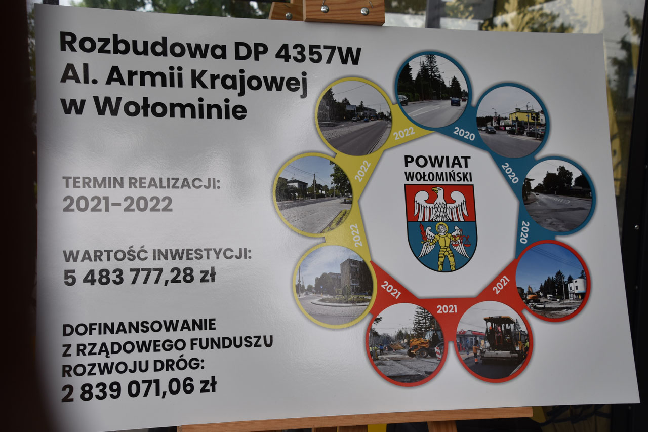 Rozbudowa drogi powiatowej al. Armii Krajowej w Wołominie na odcinku od ronda na skrzyżowaniu ul. Załuskiego/Wołomińskiej do ul. Piłsudskiego została dofinansowana z Rządowego Funduszu Rozwoju Dróg w kwocie 2 839 071,06 zł. Koszt zadania to blisko 5,5 mln zł. Długość zmodernizowanego odcinka to ponad 800 metrów.