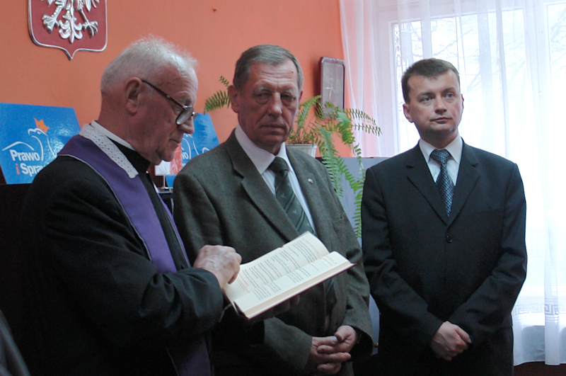 Biuro poświęcił ks. prałat Józef Kamiński, który stwierdził – Wielokrotnie byłem zapraszany na uroczyste otwarcia różnych biur poselskich, ale pierwszy raz zostałem poproszony o poświęcenie biura i o modlitwę. Jak podkreślił poseł Błaszczak biuro będzie prowadziło bardzo aktywną działalność. Będą się tu ponownie odbywały porady prawne prowadzone przez Radosława Wasilewskiego, obecnego wiceburmistrza Wołomina i Bogdana Kura.
