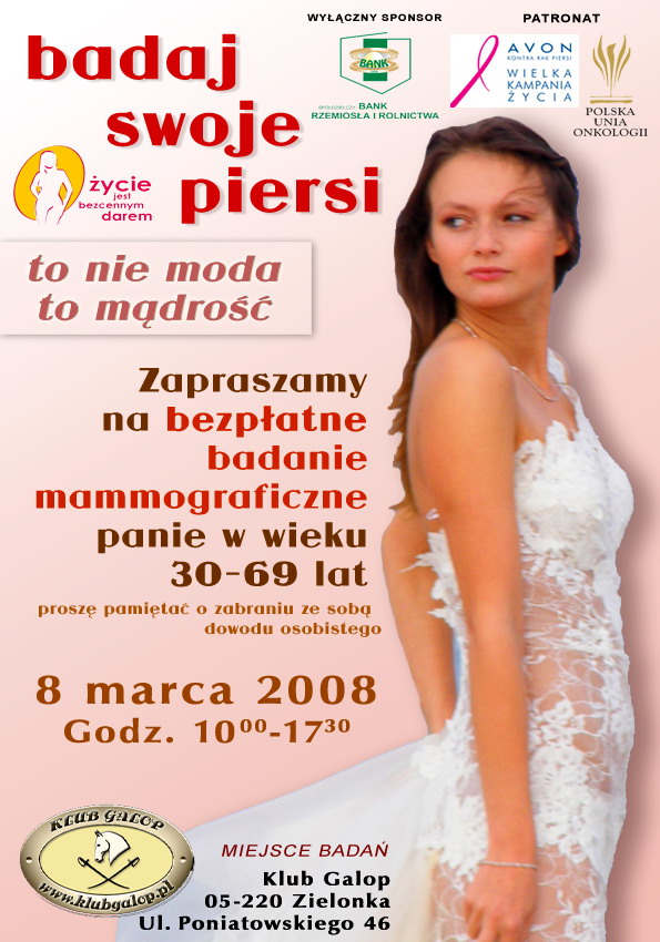 Klub Galop w Zielonce zaprasza na bezpłatne badanie mammograficzne panie w wieku 30-69 lat już 8 marca podczas wyborów Miss Foto Models Powiatu Wołomińskiego. Pamiętaj o badaniu swoich piersi – to szansa na wczesne wykrycie raka.
