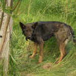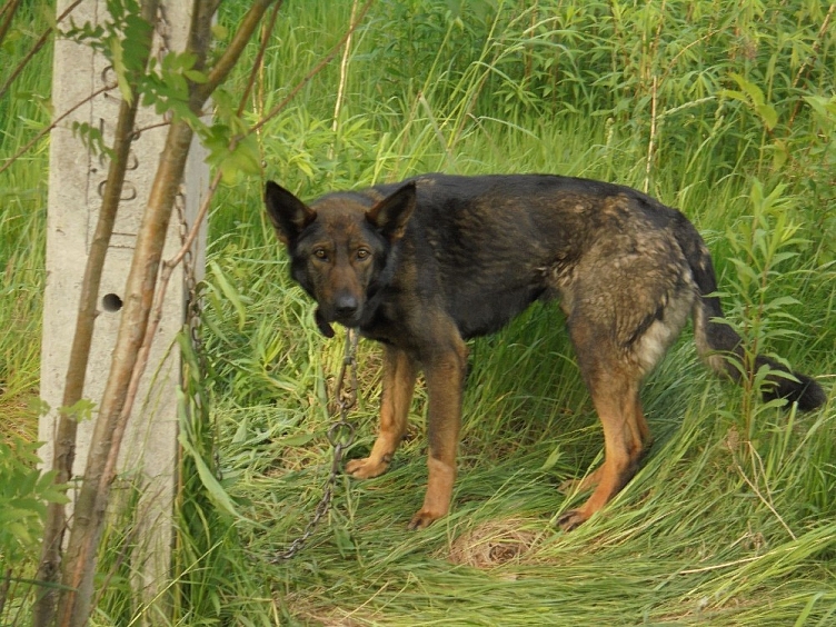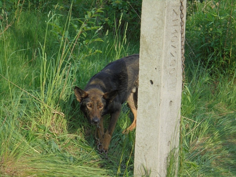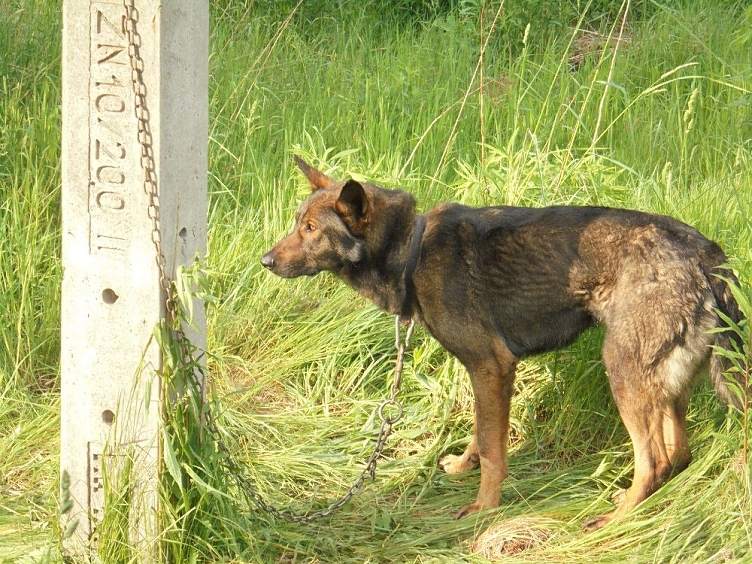 Pies rasy wilczur, ciemnej maści, agresywny, został znaleziony w rejonie ulicy 1 Maja w krzakach pomiędzy stacją paliw BP a siłownią, był przywiązany łańcuchem do słupa energetycznego.