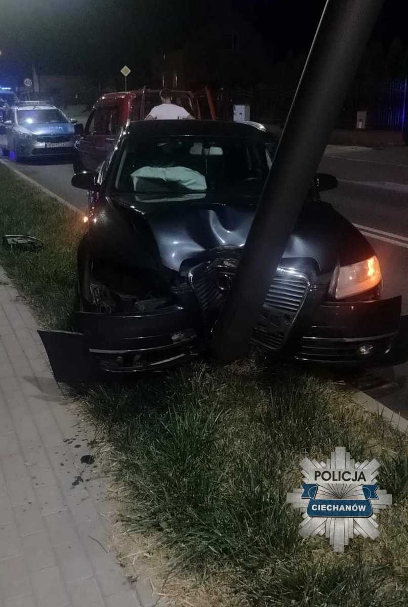 W minioną niedzielę (8.09) po godz. 1 dyżurny ciechanowskiej komendy otrzymał zgłoszenie od świadka o zdarzeniu drogowym na ul. Leśnej w Ciechanowie. Skierowani na miejsce policjanci ustalili, że 41-letni kierowca audi stracił panowanie nad pojazdem i uderzył w latarnię. Gdy mundurowi przyjechali na miejsce, mężczyzna z pomocą innego kierowcy próbował odholować auto. Policjanci sprawdzili stan trzeźwości kierowcy audi. Wynik badania to ponad 2,5 promila alkoholu w organizmie.