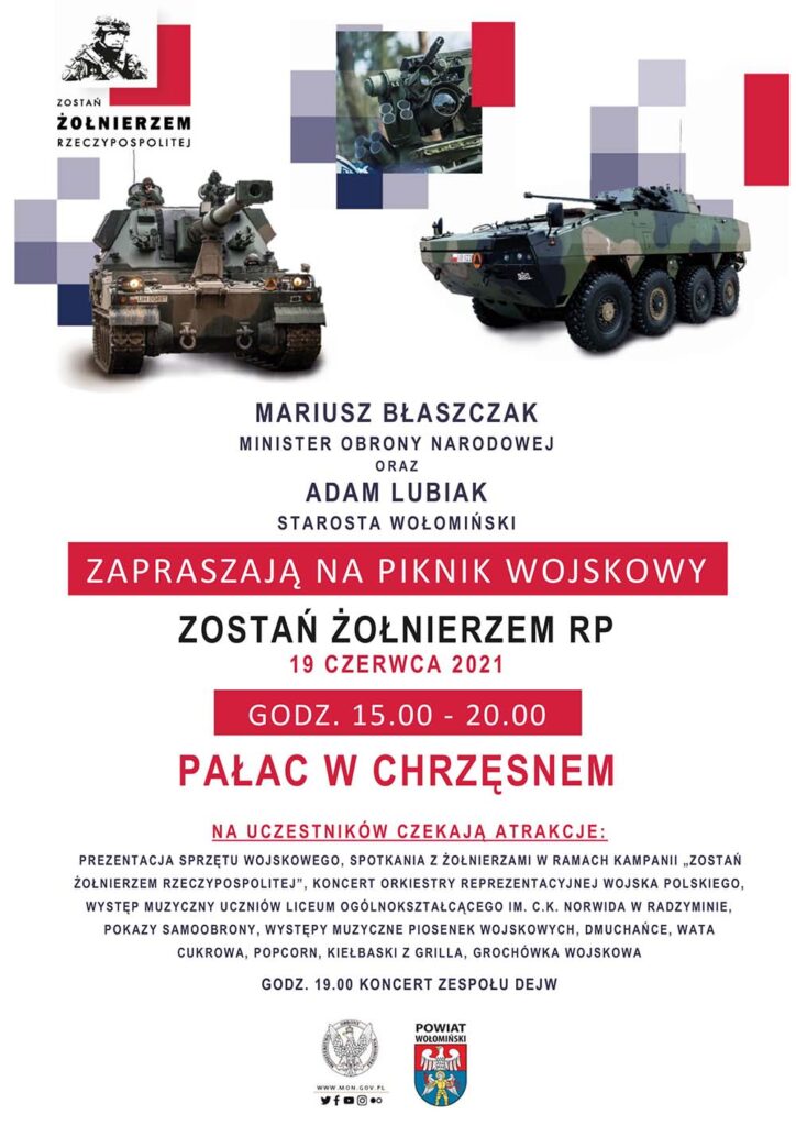 Starostwo Powiatowe zaprasza na Piknik Wojskowy ?Zostań żołnierzem RP?, który odbędzie się w Pałacu w Chrzęsnem w najbliższą sobotę 19 maja.