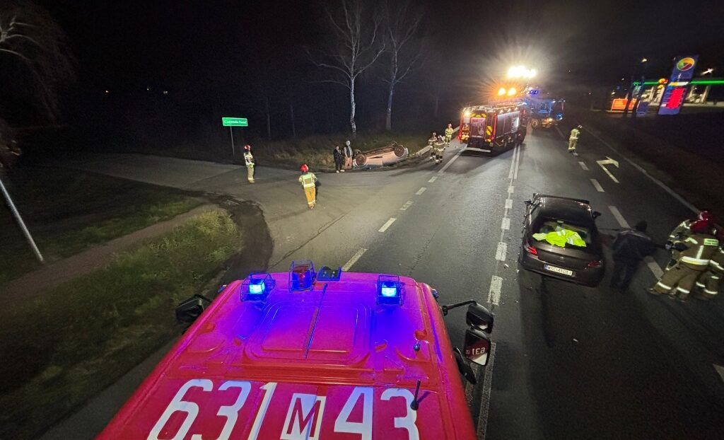 Zderzenie trzech samochodów na DK50. Jedno z aut dachowało.