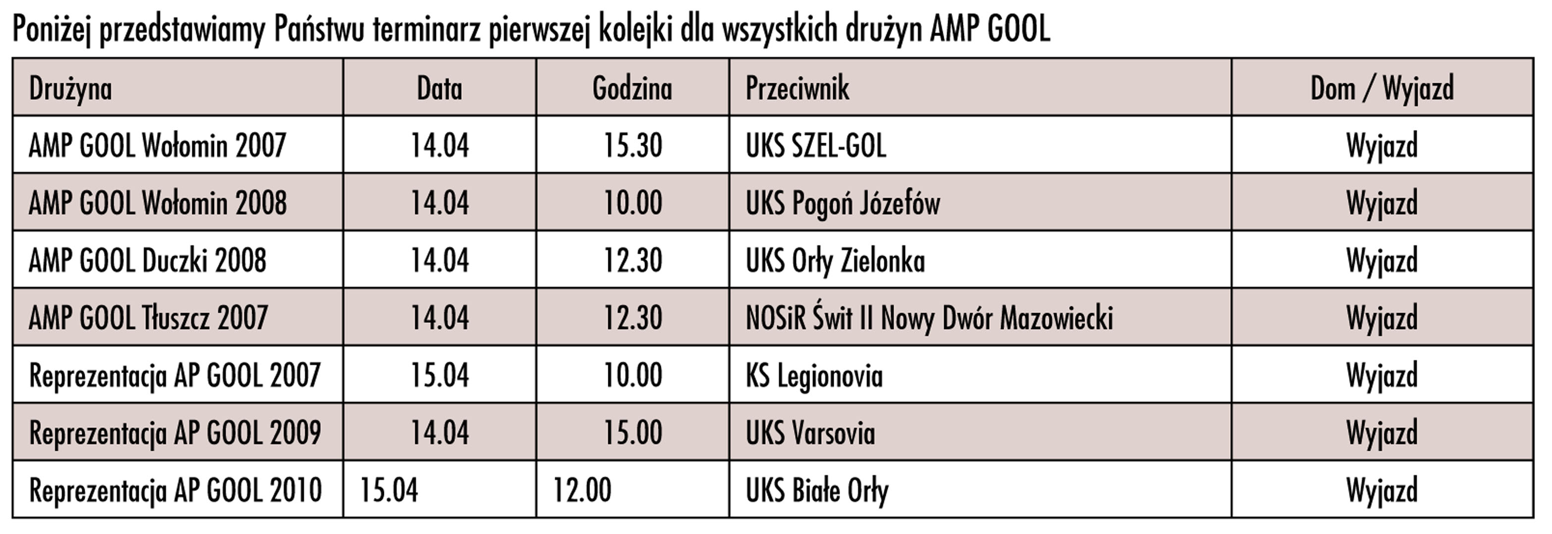Przed nami początek ligowych zmagań w lidze Mazowieckiego Związku Piłki Nożnej. Jest to o tyle wyjątkowe wydarzenie, iż do rozgrywek przystąpią cztery nowe drużyn AMP GOOL w różnych kategoriach wiekowych: AMP GOOL Wołomin (rocznik: 2007 i 2008), AMP Duczki (rocznik: 2008) oraz AMP Tłuszcz (rocznik:2007). Swoje pierwsze mecze chłopcy rozegrają już w najbliższą sobotę, 14 kwietnia.