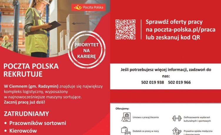 Poczta Polska poszukuje pracowników do kompleksu logistycznego, wyposażonego w najnowocześniejsze maszyny sortujące, znajdującego się w miejscowości Ciemne.