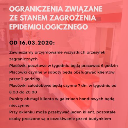Organizacja obsługi klienta w placówkach pocztowych będzie oparta o zasadę, że przy każdym czynnym okienku może przebywać jedna osoba. Szczegółowe informacje zostaną umieszczane na drzwiach wejściowych. Mając na uwadze bezpieczeństwo klientów i pracowników w placówkach zostały już wprowadzone tzw. STREFY OCHRONNE w bezpośredniej obsłudze klienta. Osoby wchodzące do placówki proszone są o zachowanie odległości około 1,5 metra podczas oczekiwania na obsługę i pozostawanie za znajdującą się na podłodze taśmą także w trakcie obsługi. Bliżej do pracownika klienci powinni podchodzić jedynie w celu okazania dokumentów i innych niezbędnych czynności, na wyraźną prośbę pracownika Poczty.