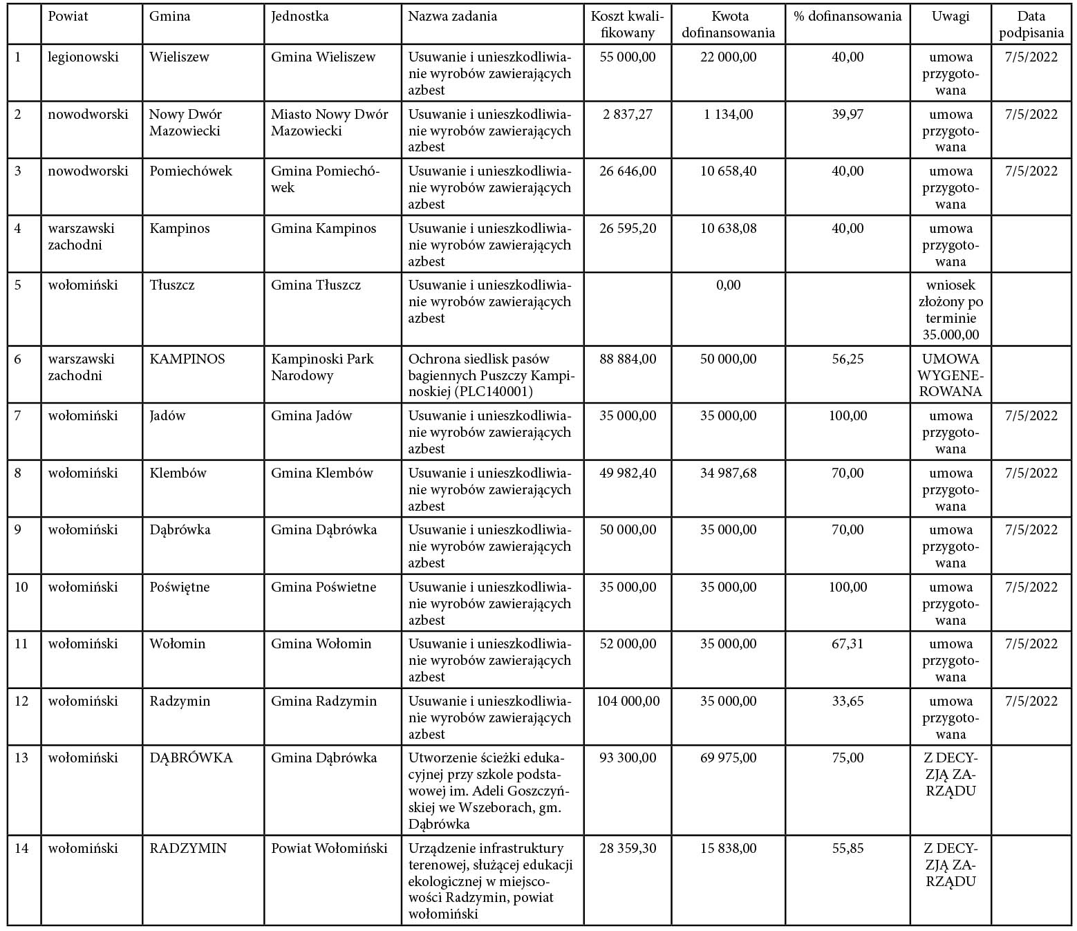 Z terenu powiatu wołomińskiego środki na usuwanie i unieszkodliwianie wyrobów zawierających azbest otrzymały gminy Jadów, Klembów, Dąbrówka, Poświętne, Wołomin i Radzymin. Gmina Dąbrówka pozyskała również środki na utworzenie ścieżki edukacyjnej przy Szkole Podstawowej im. Adeli Goszczyńskiej we Wszeborach.