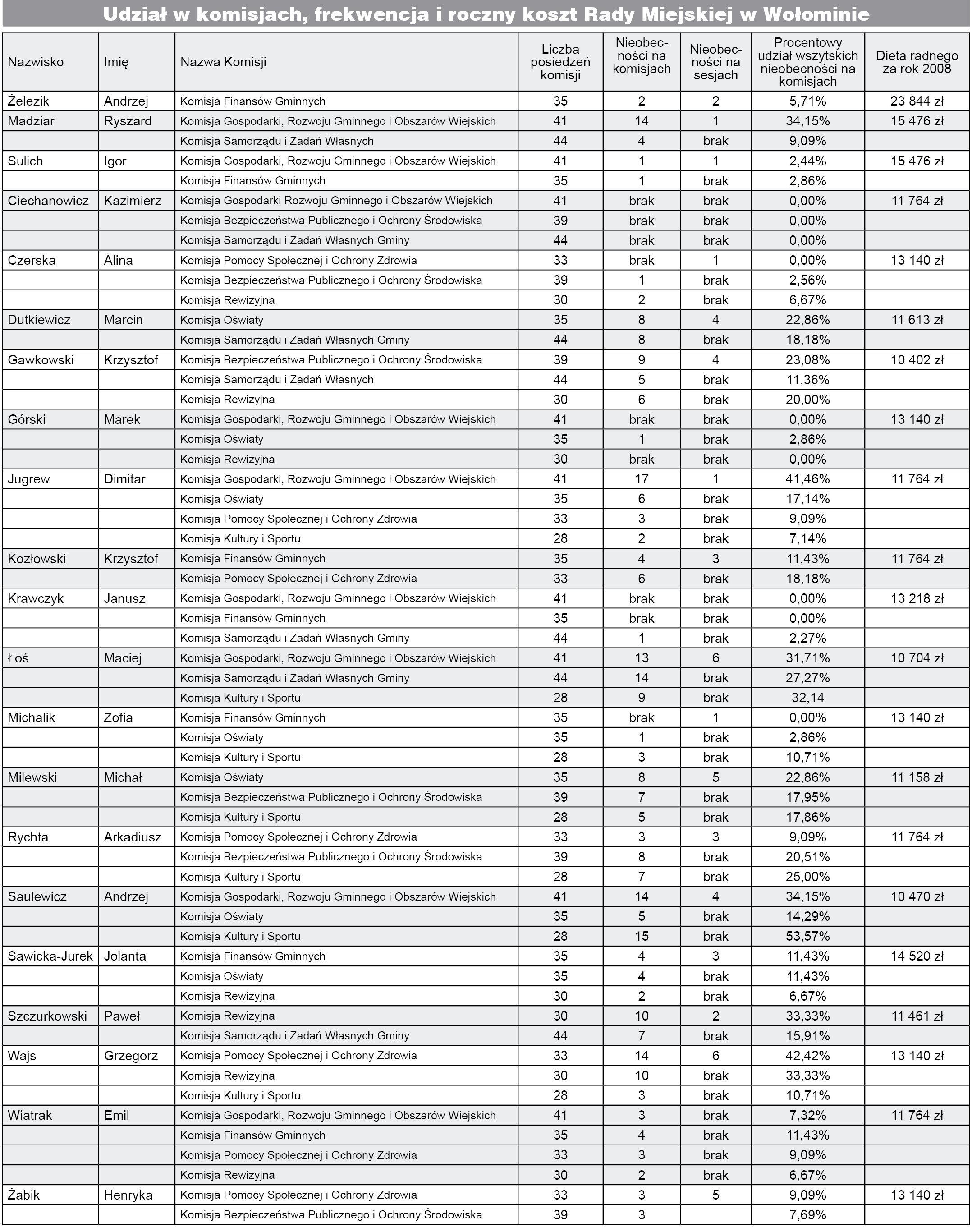 Dziś prezentujemy Radę Miejską w Wołominie. Zebraliśmy informacje związane z uczestnictwem w pracach poszczególnych komisji branżowych jak i podczas posiedzeń Rady Miejskiej na której zapadają ważne dla gminy i jej mieszkańców decyzje. Jedna z tabel przedstawia również zestawienie finansowe za rok 2008.