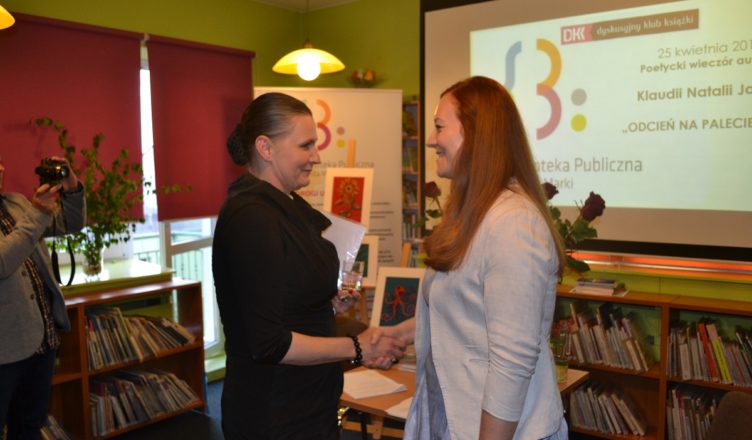 Atrakcyjności wieczoru dodała również obecność pani Agnieszki Lużyńskiej ? Przewodniczącej Komisji Oświaty, Kultury i Sportu, która zasłuchanym uczestnikom spotkania czytała wiersze autorki. Wspaniałe grono gości w różnym wieku pani Klaudia Jaissle zauroczyła swoją otwartością, skromnością, ciekawością świata oraz dużą wrażliwością. Spotkanie przebiegło w bardzo miłej i sympatycznej atmosferze. Nawet po jego zakończeniu poetycka dusza pani Klaudii niczym nimb otaczała wciąż słuchaczy. Wieczór zakończył się podziękowaniem za przybycie i wspólnie spędzony czas. Nie zabrakło autografów, dedykacji w książkach oraz wspólnych zdjęć poetki z czytelnikami. Mieszkańcy podczas spotkania mieli również niepowtarzalną okazję podziwiać prace plastyczne pani Klaudii.