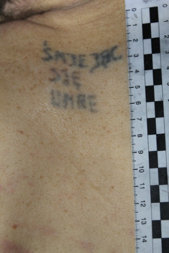 Znaki szczególne: na plecach tatuaż ?Śmiejąc się umre?
