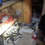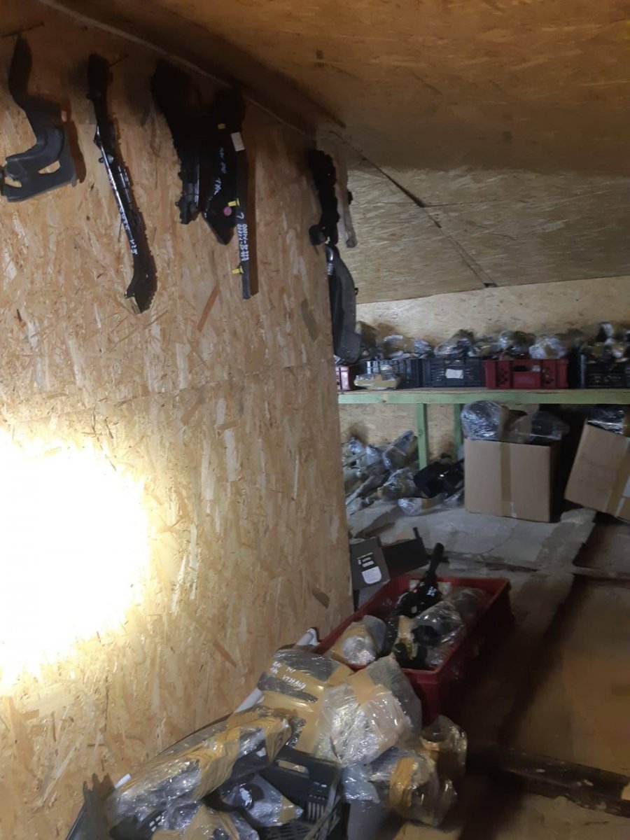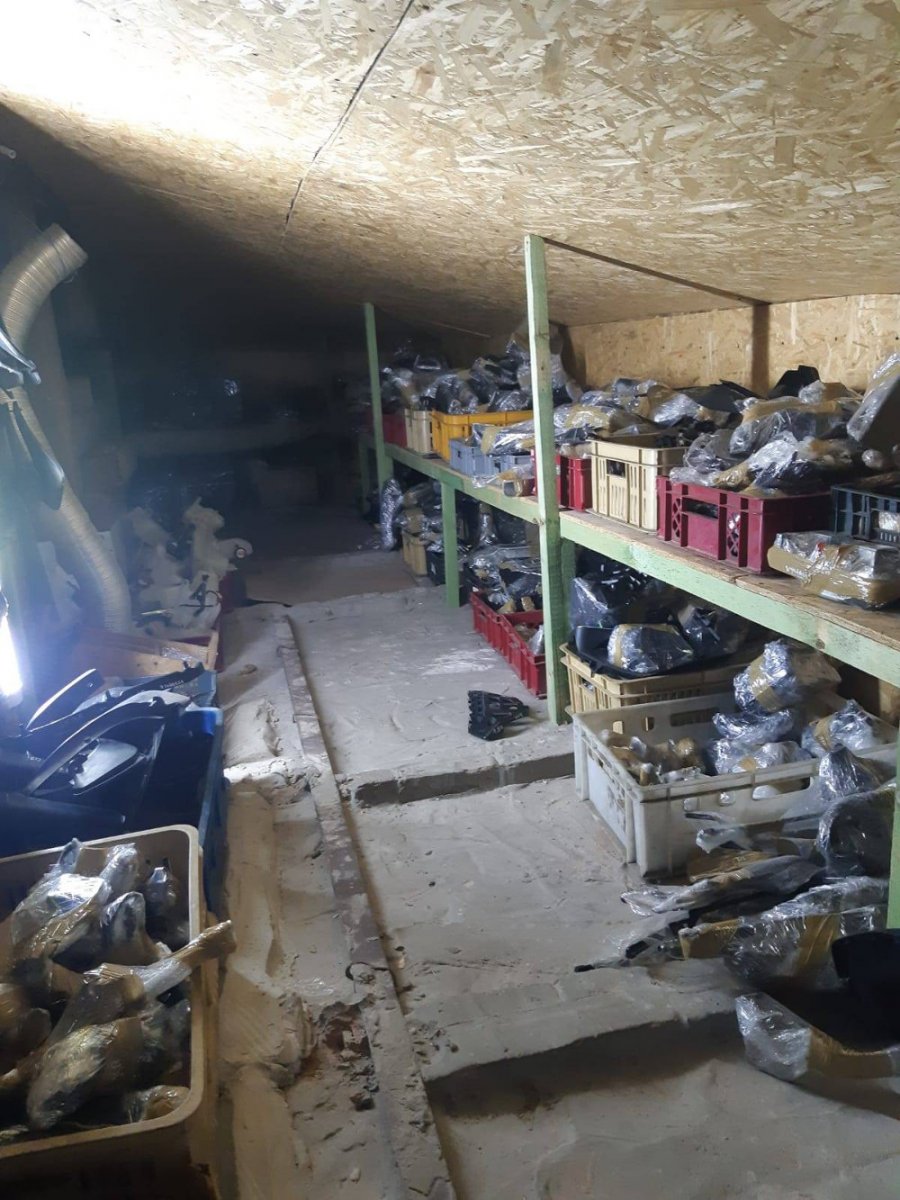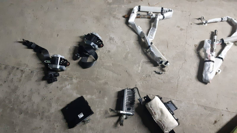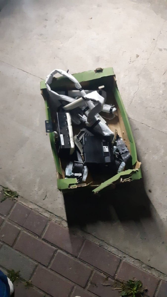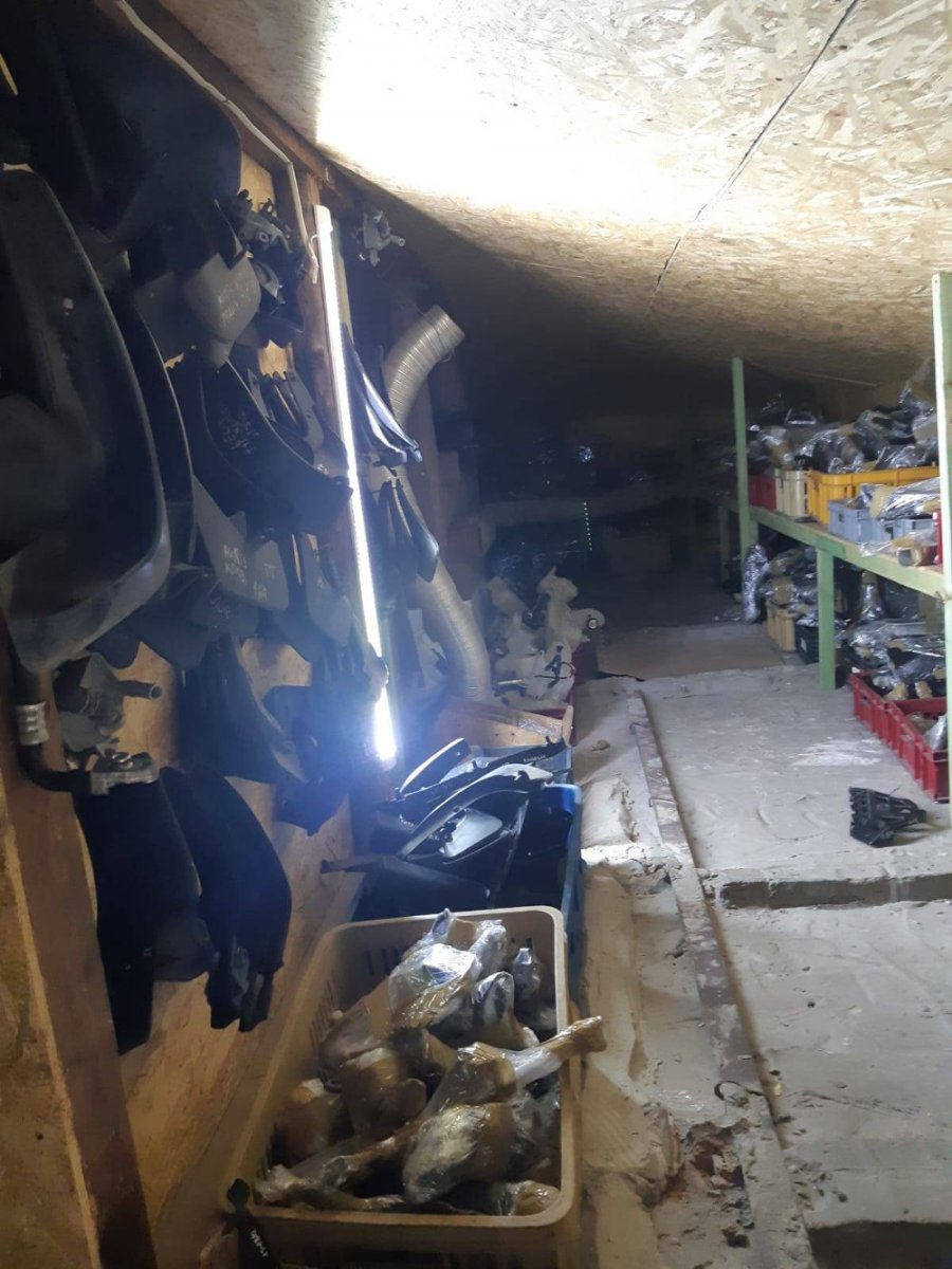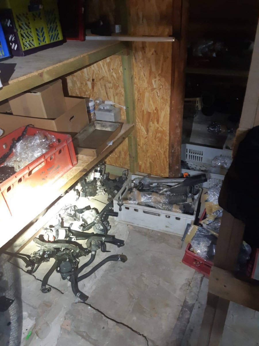 Policjanci bardzo dokładnie przeszukali całą posesję. Na jej terenie ujawnili silniki od pojazdów, poduszki powietrzne, kurtyny boczne, pasy bezpieczeństwa i inne zdemontowane części samochodowe.