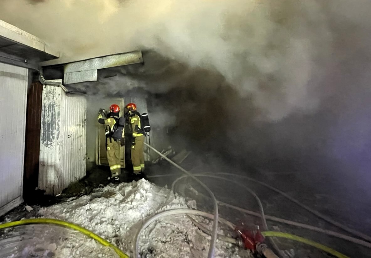Nocny pożar budynku w Stryjkach. Na miejscu liczne zastępy straży pożarnej.